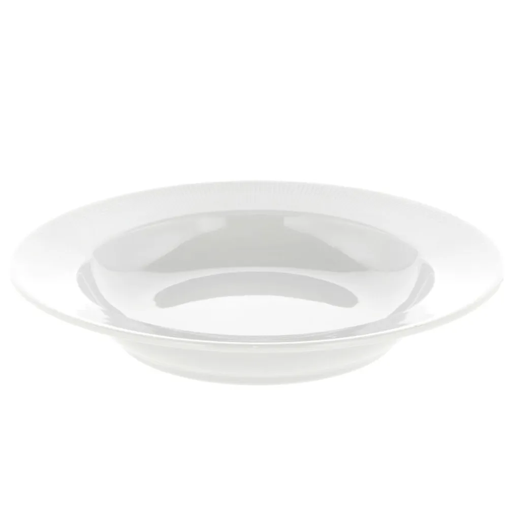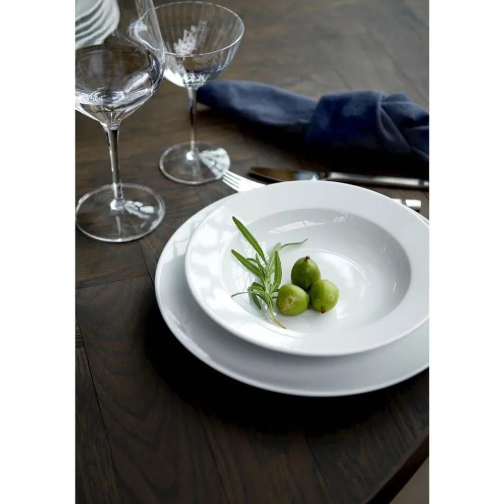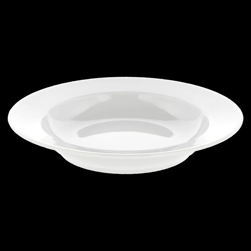 Eventail dyb tallerken med fane, 22 cm. Velegnet til morgenmad, supper, pasta og mange andre retter. Træd ind i en fortryllende verden med Eventail – et betagende stel prydet af et forførende mønster, der leder tankerne hen på elegante vifter. Med sin legende og sofistikerede udstråling tilføjer Eventail en sublim æstetik til dit måltid. Dette sande kunstværk hæver din spiseoplevelse til nye højder.
