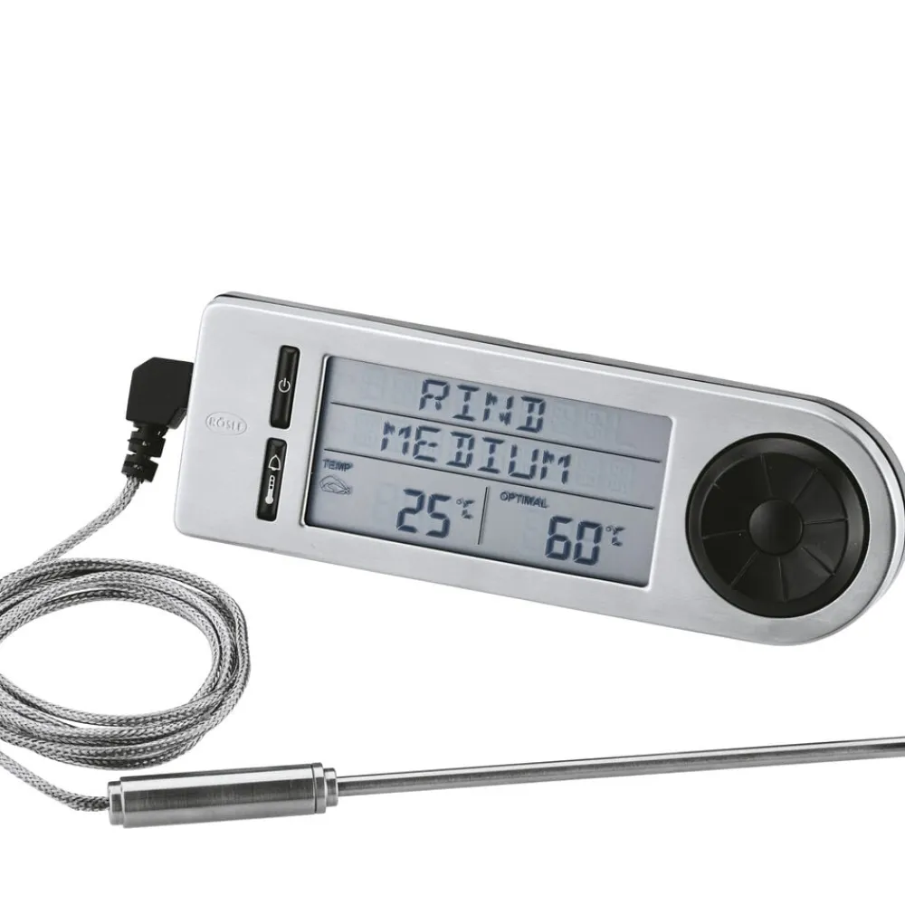 Til bestemmelse af den ideelle kernetemperatur for fem forskellige typer kød. To sensorer: en sensor måler temperaturen på kødet, og en anden måler grilltemperaturen. Måleområde -20 °C til +250 ° C. Visningssprog kan vælges fra tysk, engelsk eller fransk. Kabellængde 1 m. Bruger 2 x CR2032 knapcellebatterier (medfølger ikke)