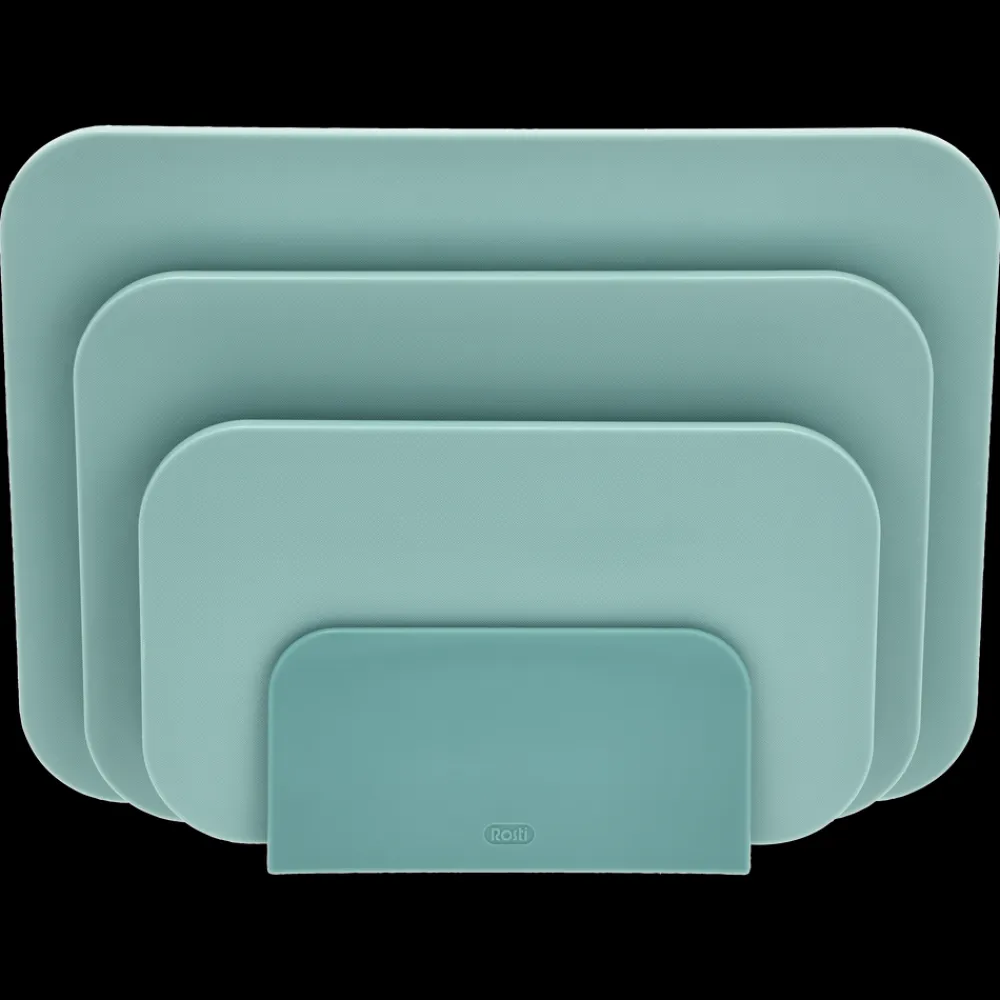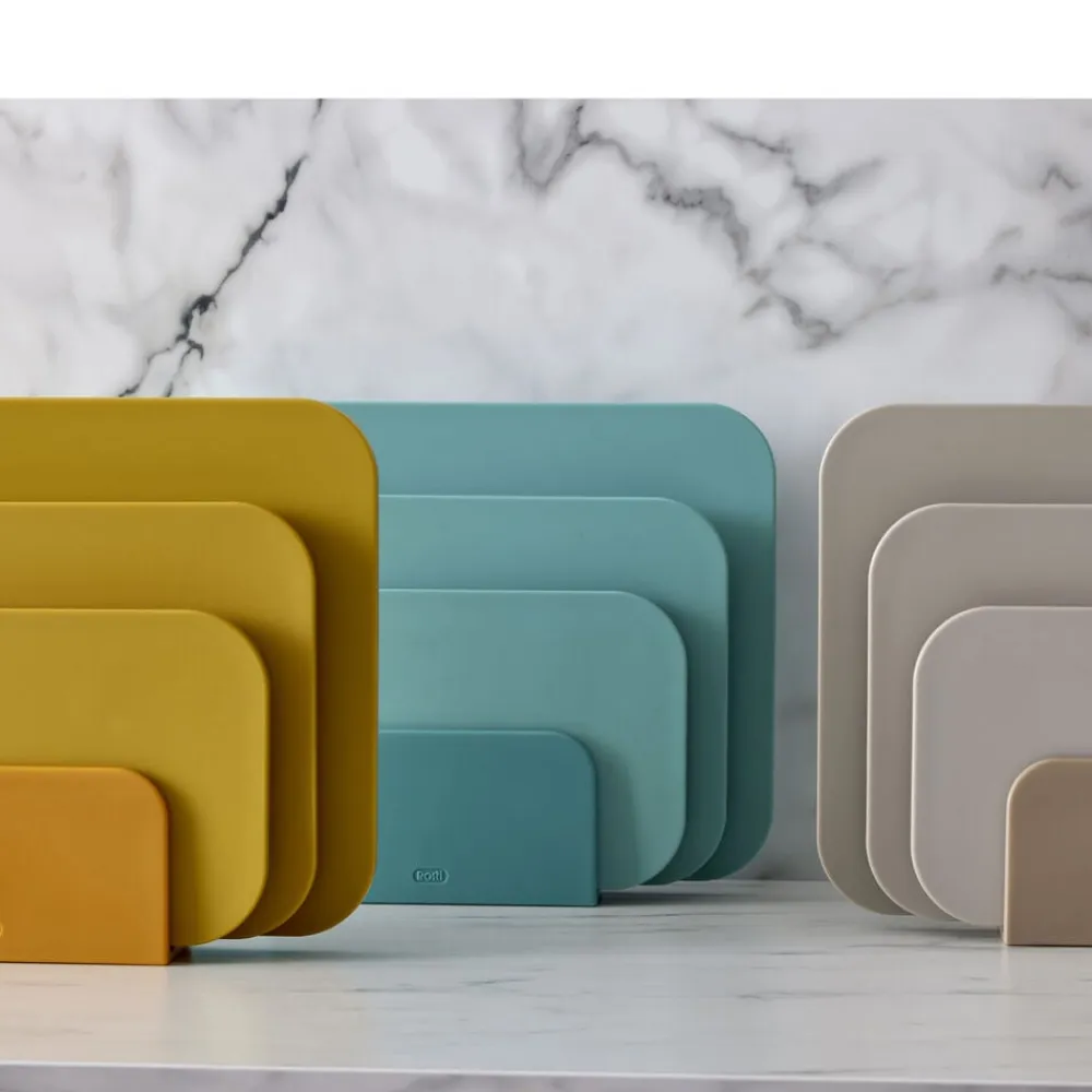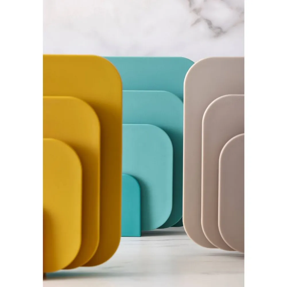 De tre størrelser er samme tykkelse og kan sagtens anvendes til servering og tages med ind på bordet til brød, pølse, oste og tapasanretninger med mere. Derfor er seriens fine farver valgt med grundig omtanke, og med sine venlige former bliver sættet et dekorativt supplement til din køkkenindretning.