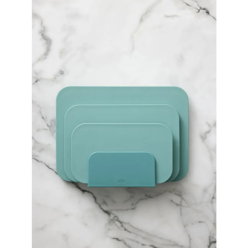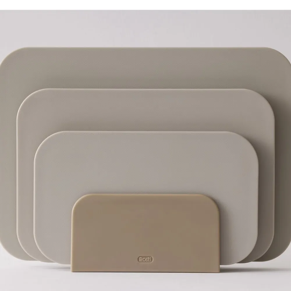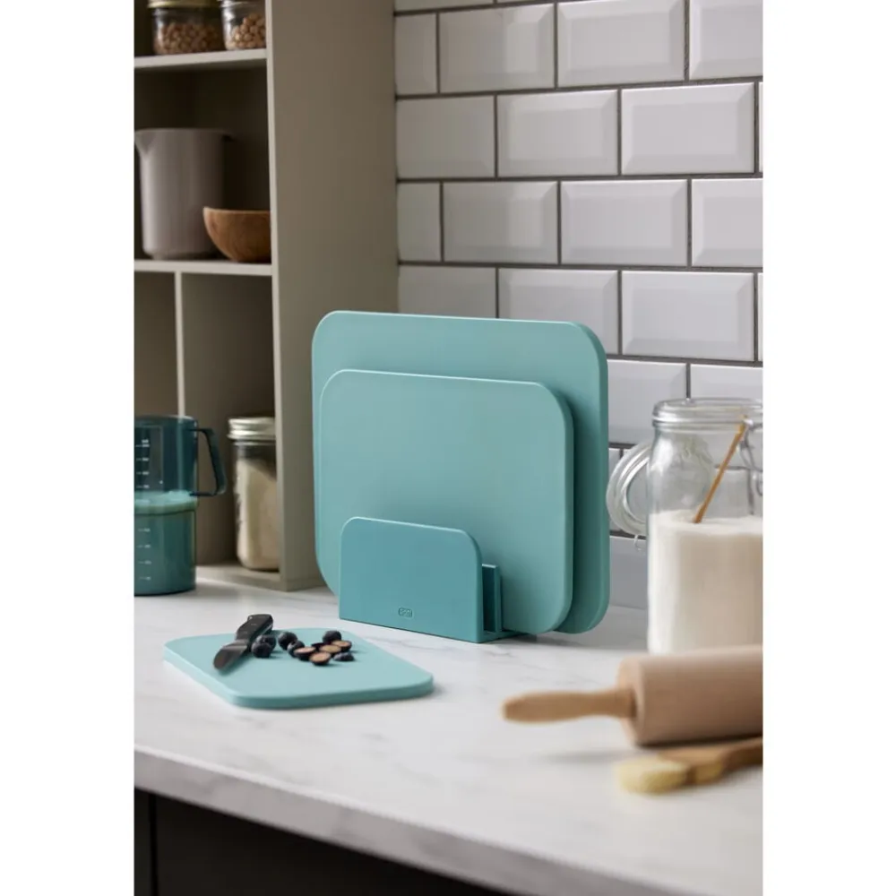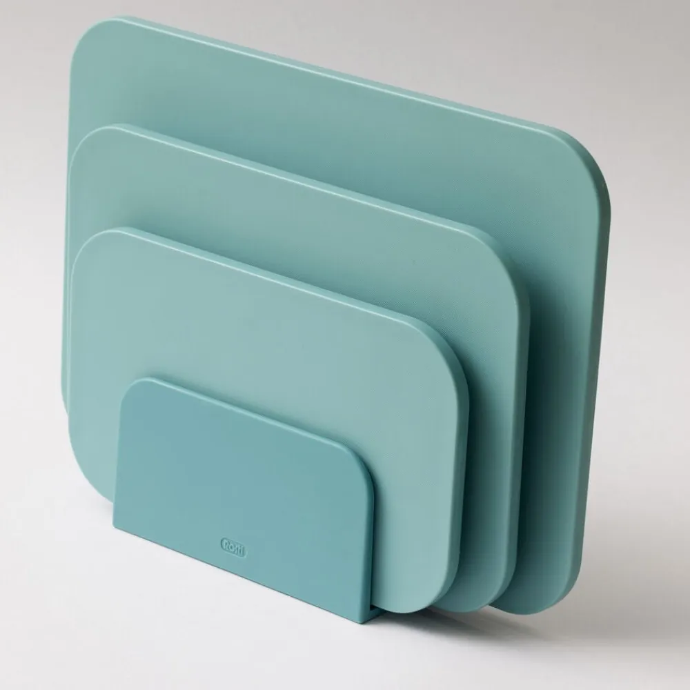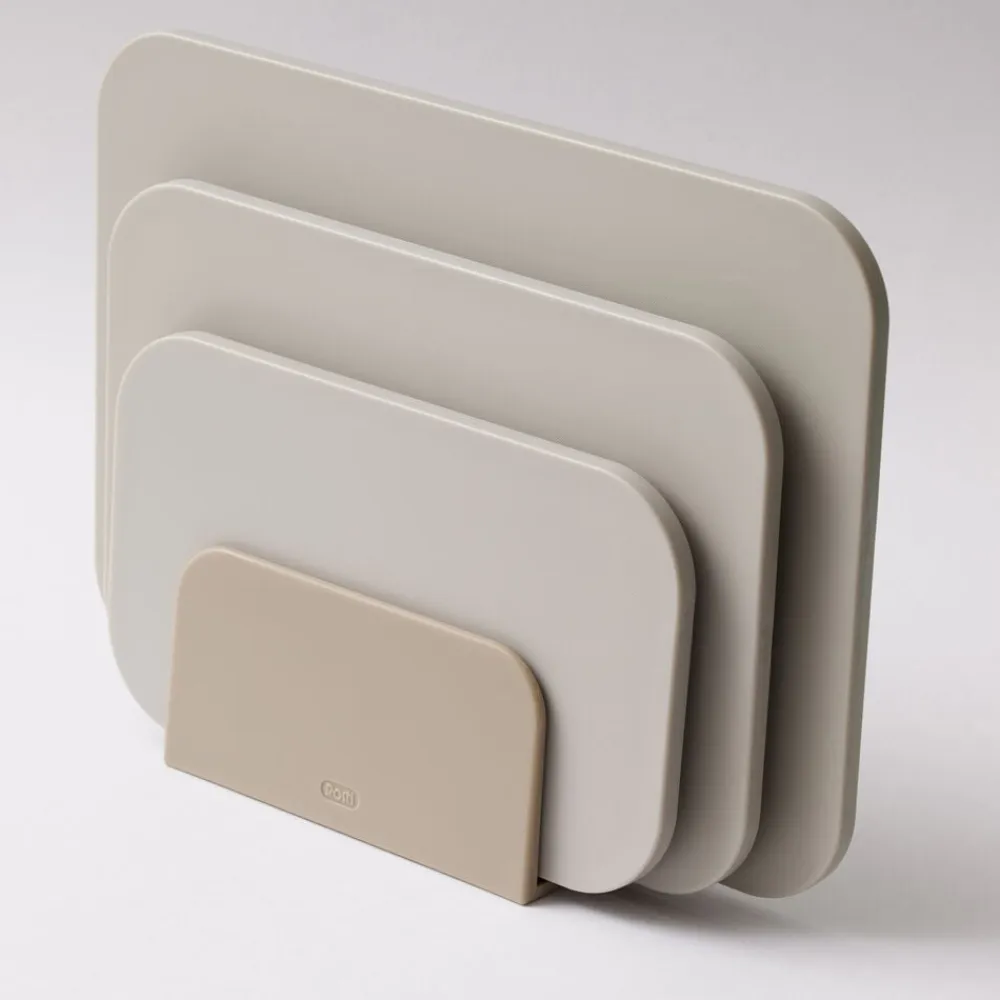 Sættet kommer med en smart holder med fokus på både opbevaring og hygiejne. Den holder skærebrætterne samlet, uden at de optager meget plads på køkkenbordet, og er udformet, så du kan sætte et fugtigt skærebræt direkte i holderen. Skærebrætterne står nemlig med lidt afstand til hinanden, og i bunden af holderen er der riller, som sikrer god ventilation og dermed hygiejne, f.eks. hvis brættet stadig er fugtigt, når det sættes på plads. Brætterne kan vaskes i opvaskemaskine.
