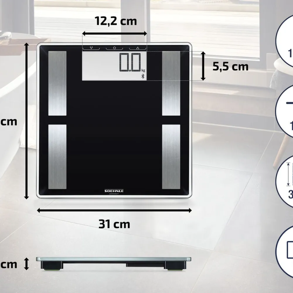 Vægten sender dine målinger til Soehnles egen S-Connect app, der er tilgængelig til iOS og Android, hvor du blandt andet kan indtaste din ønskevægt og få et nemt og overskueligt overblik. Du kan se din vægt, fedt- og væskeprocent, analyse af din muskelmasse og det anbefalede daglige kalorieindtag, forskellen i forhold til sidste vejning og hvor langt du har igen til ønskevægten. Du kan også se din BMI og forskellen i forhold til det gennemsnitlige BMI.