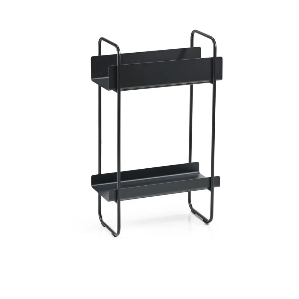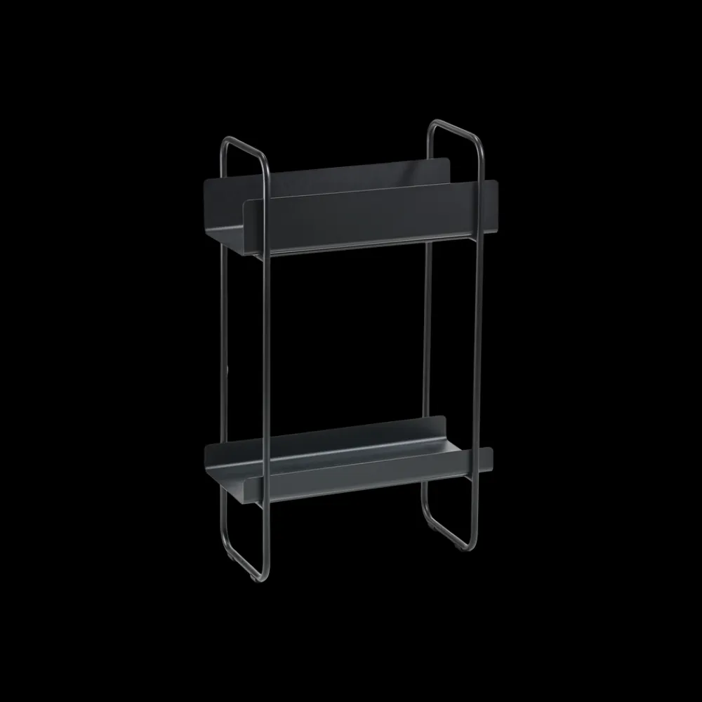 Forskøn et hjørne i stuen eller sig smukt velkommen i entreen. Det smalle konsolbord i pulverlakeret metal kan passe ind i de fleste rum, selv steder hvor gulvpladsen er sparsom. Det leveres med to hylder, som du selv kan placere efter behag og behov. Den ene hylde har høj kant, som kan holde på håndklæder, hue/handsker, hundesnore eller hvad end du har brug for.
