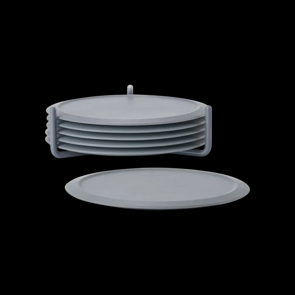 Flotte farvede glasbrikker i silikone. En blød og lydløs landing – sådan kan man bedst beskrive det, når man stiller et glas fra sig på glasbrikken i silikone. Leveres i sæt med seks glasbrikker i praktisk metalholder. Nemme at rengøre. D: 10 cm.