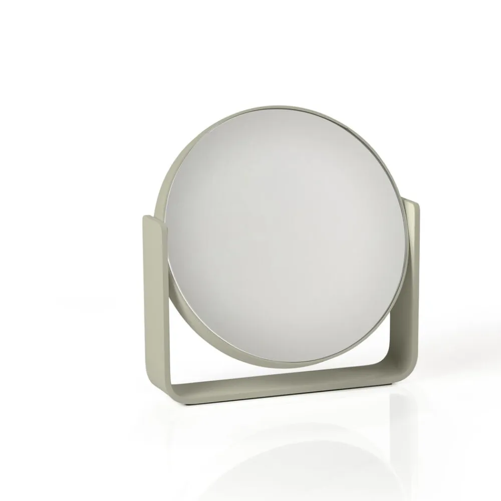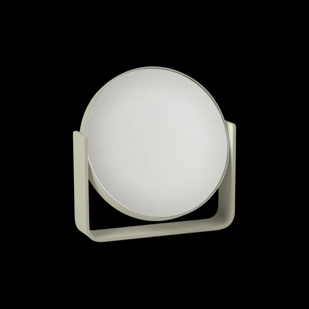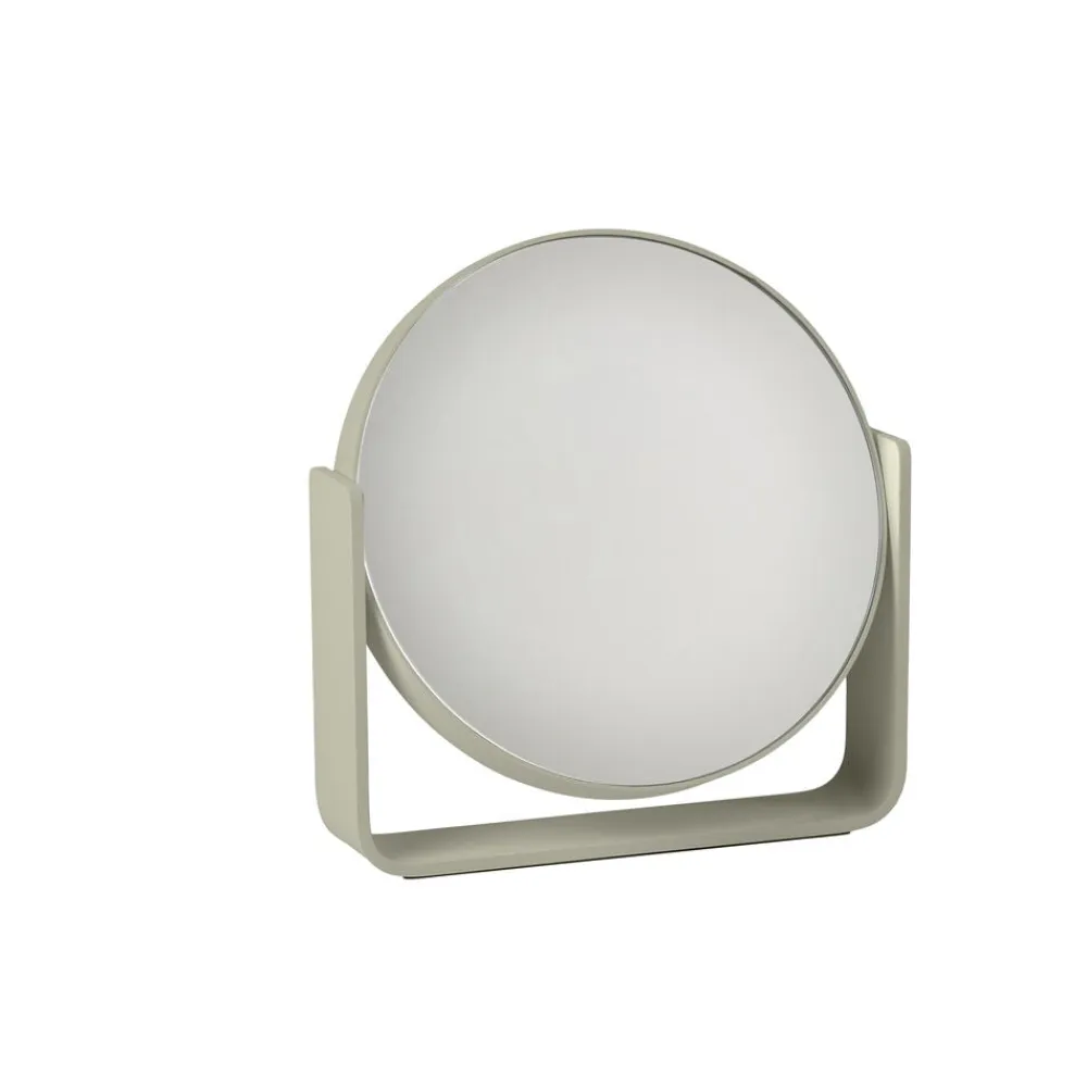 Uundværligt bordspejl, der pynter, hvor end du placerer det. Den ene side er almindeligt spejl, mens den anden forstørrer hele fem gange. Spejlet roterer sikkert om egen akse, da det bæres af en bred aluminiumsramme, som samtidig udgør spejlets stabile base. Det er pulverlakeret og har et fint mat look. Spejlet glider smukt ind i den populære UME-serie og fås i alle 7 farver: Black, White, Soft Grey, Grey, Eucalyptus, Taupe, Olive Green.