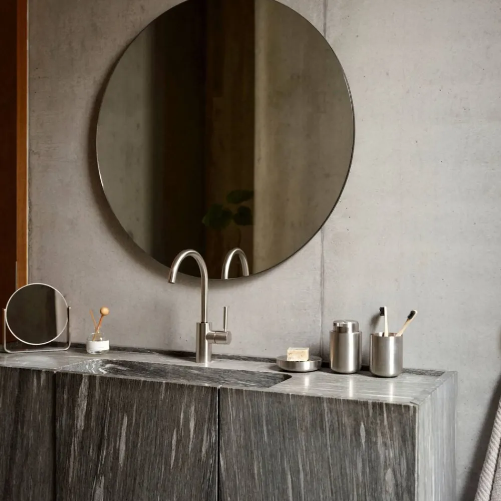 Til bordet findes både sæbedispenser, sæbeskål samt tandbørstekrus samt rundt bordspejl med vippefunktion. På trods af stålets mathed reflekterer lyset sig smukt i overfladen og giver overfladen liv og karaktér. Alt i alt en formfuldendt forvandling af en ægte Zone-klassiker.