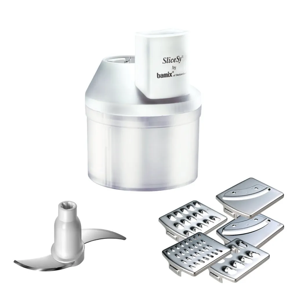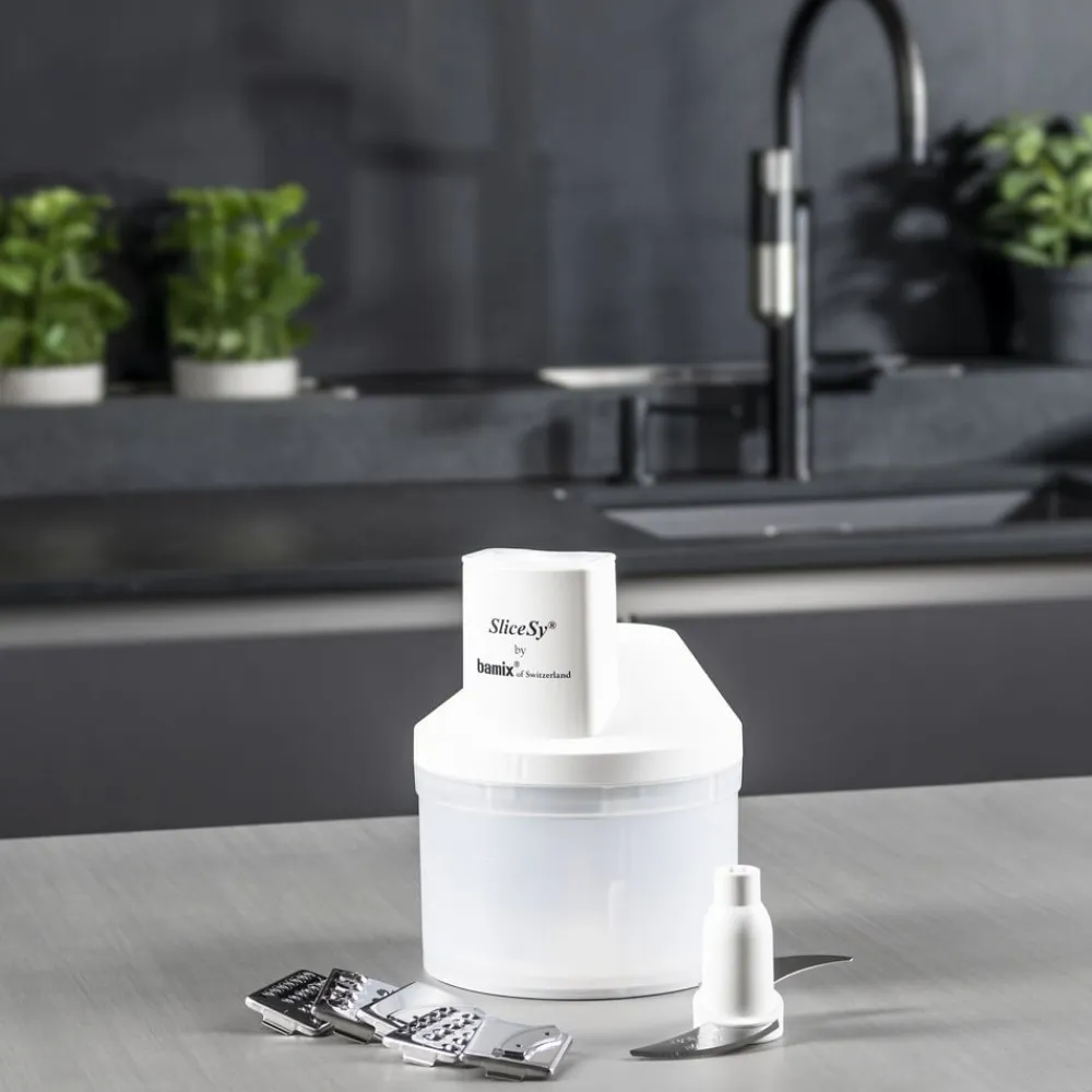 bamix®-tilbehør. SliceSy® til at hakke, rive, snitte og kværne – det hele klaret på den halve tid. Kan også bruges til at røre og blande dej. Produktet har en kapacitet på ca. 6 dl og leveres med 5 knivblade.