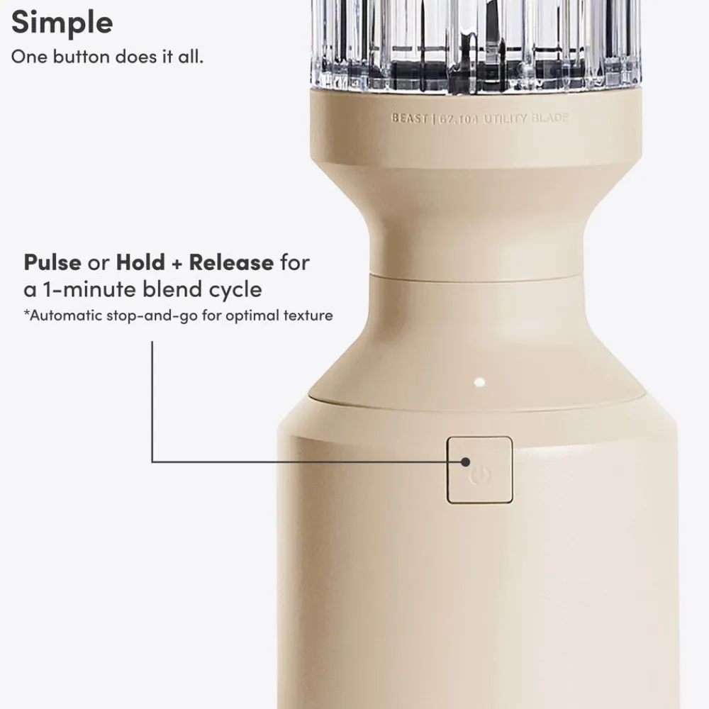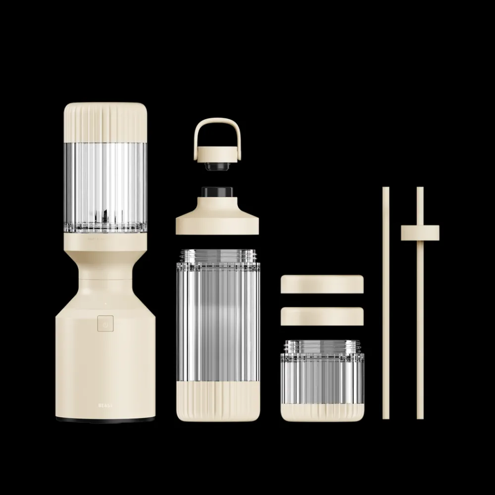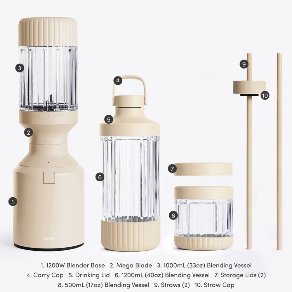 Beast Mega Plus 1200 leveres med tre blenderbeholdere (500, 1000 og 1200 ml), der fungerer som drikkebeholdere, når du sætter drikkelåg og sugerørshætte på og tager dem med dig på farten. Den rillede beholder giver dig et godt greb.