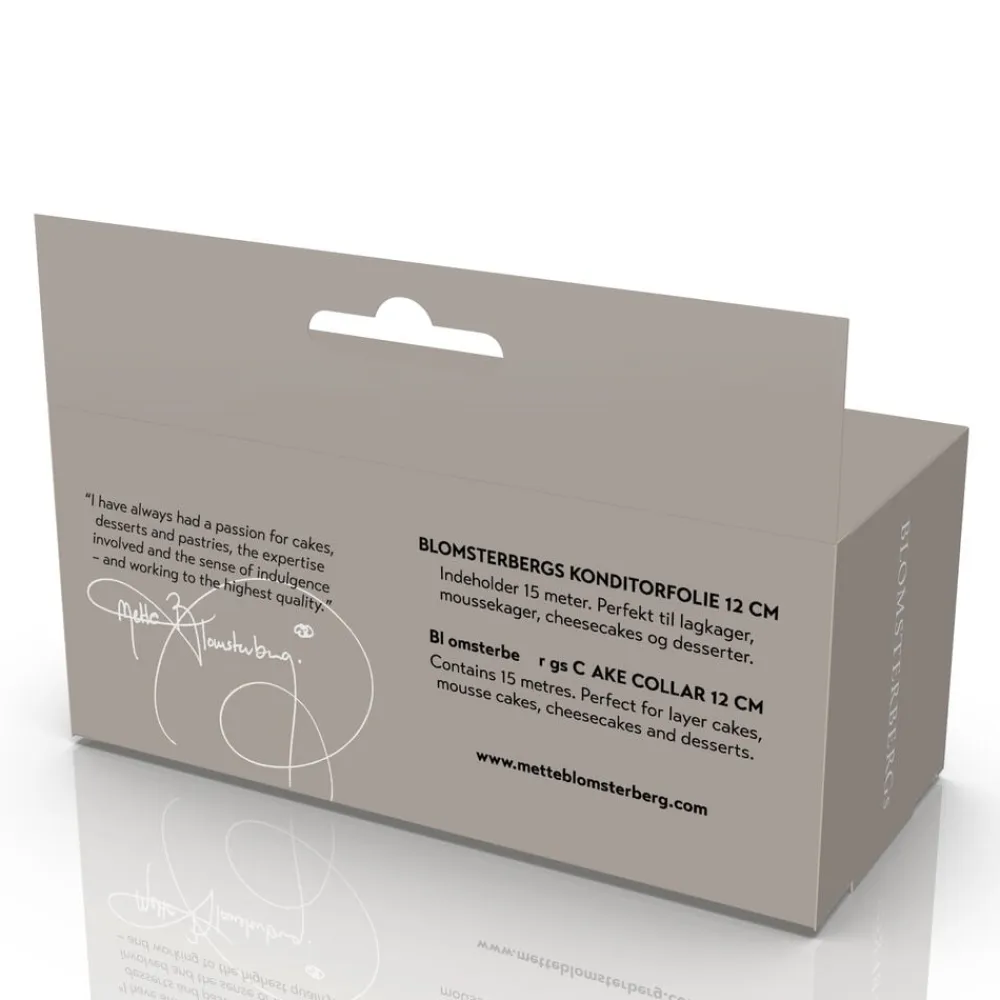 I denne rulle konditorfolie er der 15 meter. Bredden på folien er 12 cm, og den er 0,1 mm tyk. I en professionel kvalitet, som er nem at arbejde med. Ideel når du skal bage en kage, som er højere end formen eller ved samling af kager i flere lag. Konditorfolien sikrer, at din kage ikke hænger fast i formen, hvilket resulterer i skarpe, rene kanter – og så bliver det nemmere at lave flerlagskager. For chokoladeelskere er folien også perfekt til flotte chokoladedekorationer, da den giver en glat overflade, hvor chokoladen kan stivne og derefter nemt fjernes. Konditorfolien kan nemt vaskes og bruges igen og igen. Tåler fryser.