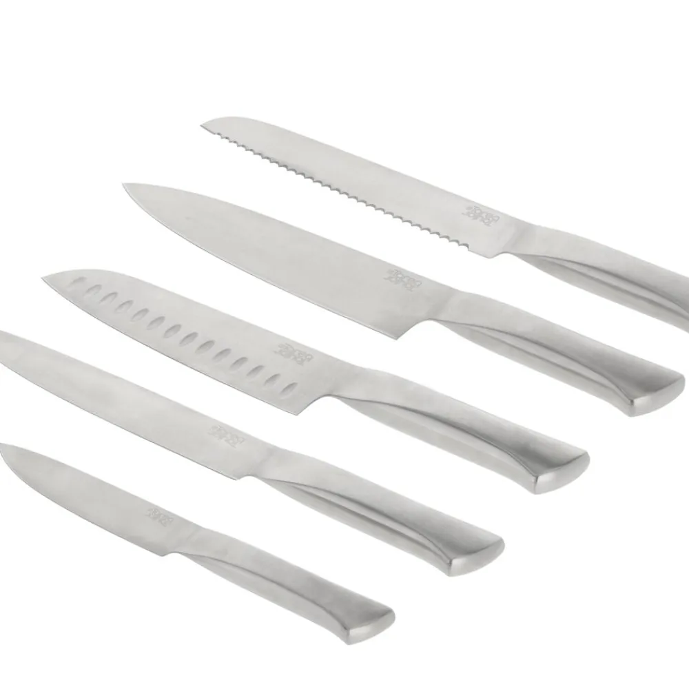 Knivsæt bestående af urtekniv 9 cm, santokukniv 18 cm, filetkniv 20 cm, brødkniv 20 cm og kokkekniv 20 cm.