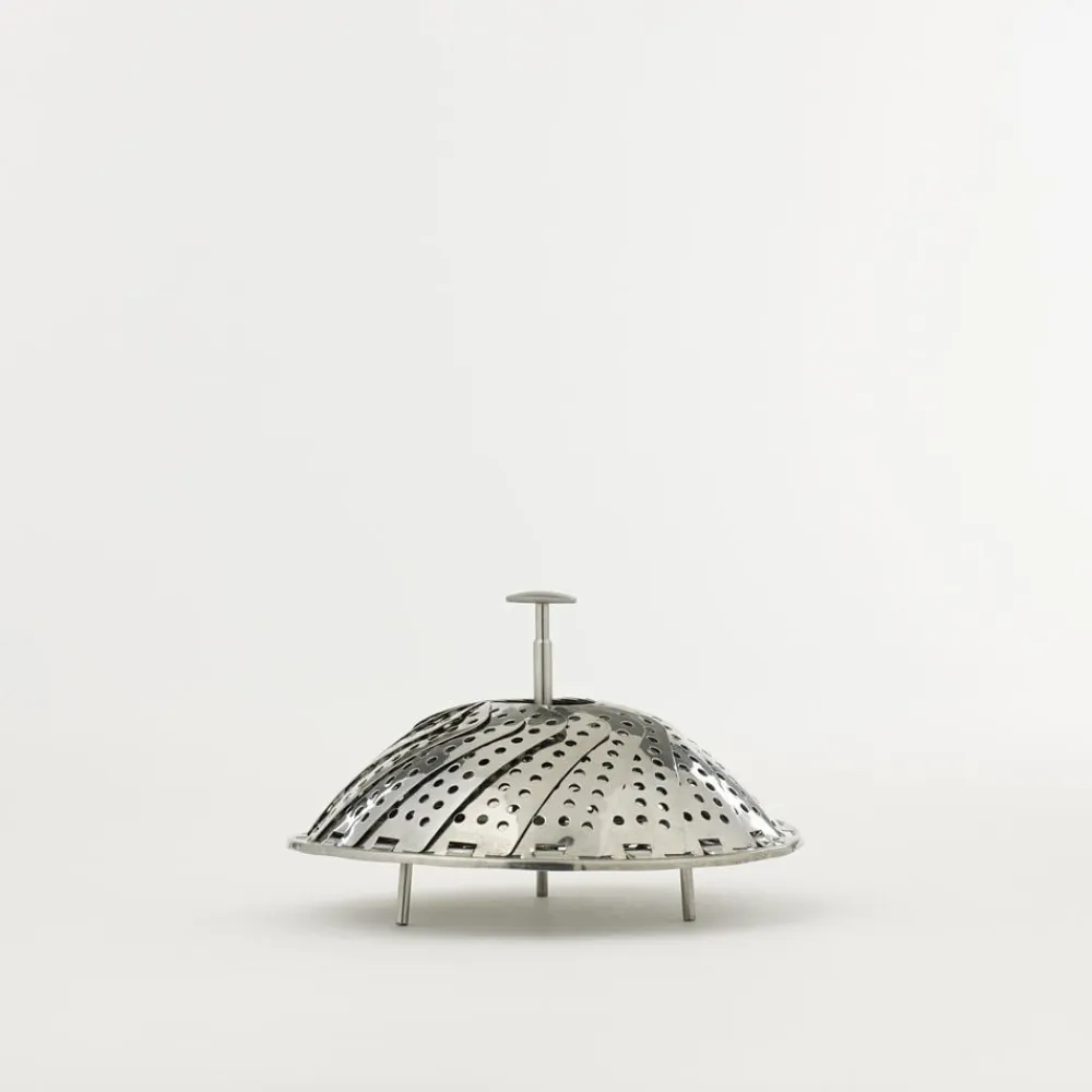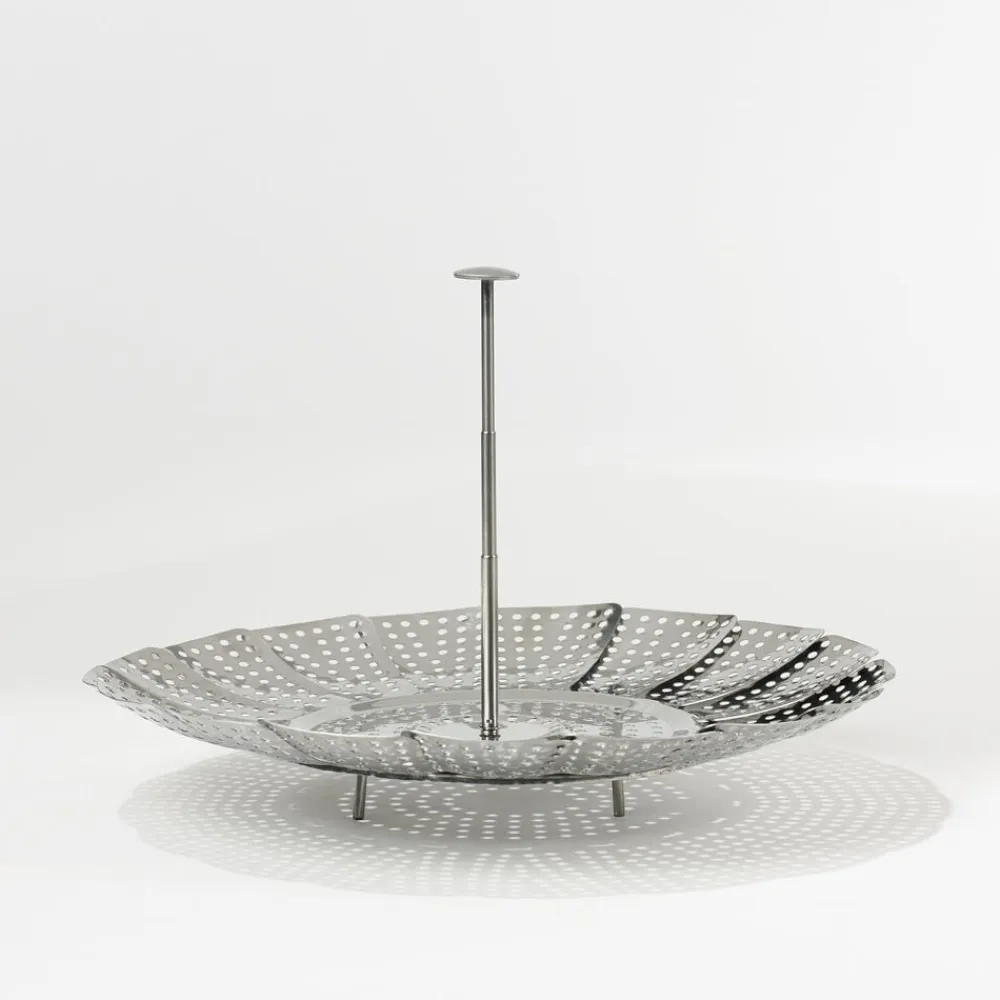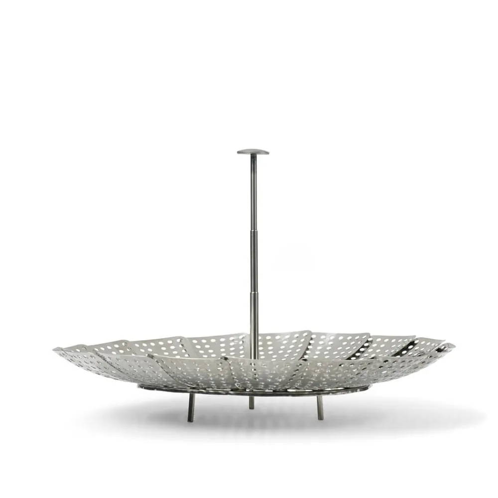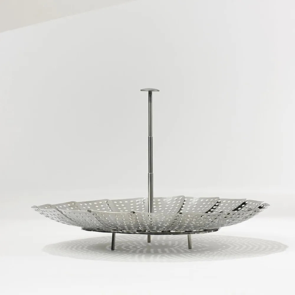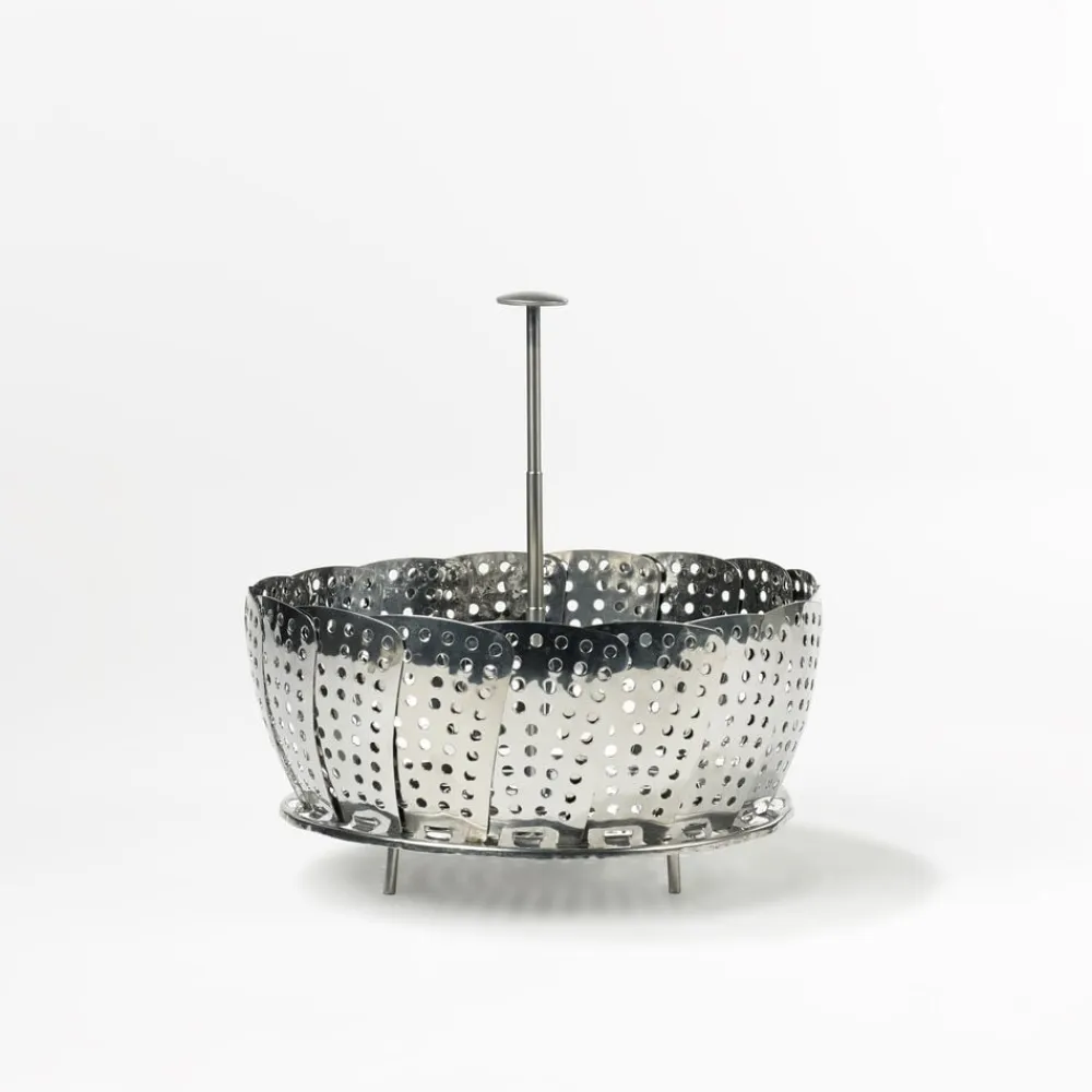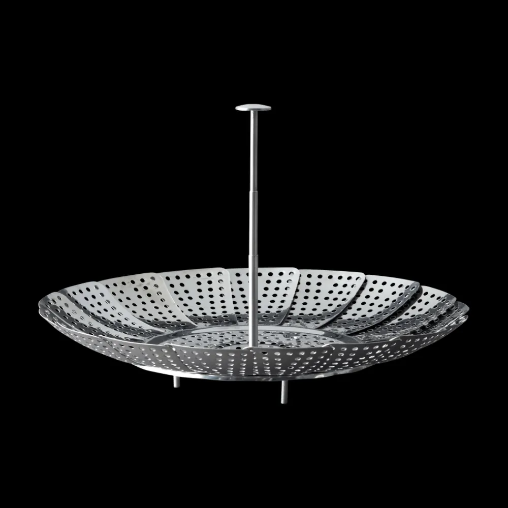 Dampede grøntsager smager af mere og bevarer vitaminerne bedre. Dampindsatsen sættes ned i en gryde med lidt vand og er også velegnet til dampning af fisk og skaldyr. Dia. 23 cm, rustfrit stål med foldbare ben og teleskophåndtag.