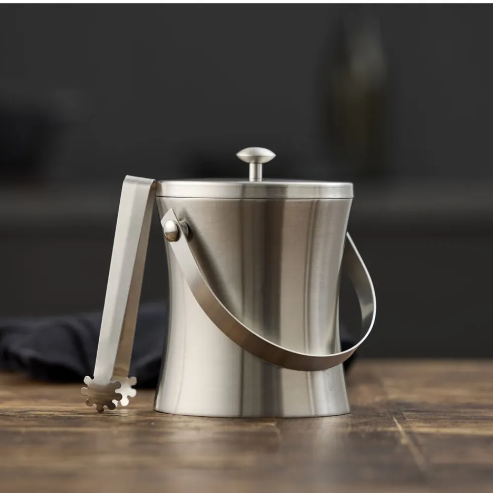 Funktionel isspand i blankpoleret rustfrit stål, med hank og integreret tang. Isspandens dobbeltvæg holder isterninger kolde, mens den aftagelige rist adskiller isterningerne fra det smeltede vand.