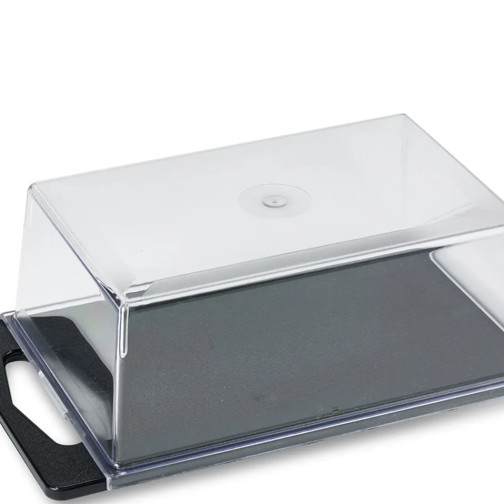 Låget er i transparent plast, og skærebrættet er i sort plast.