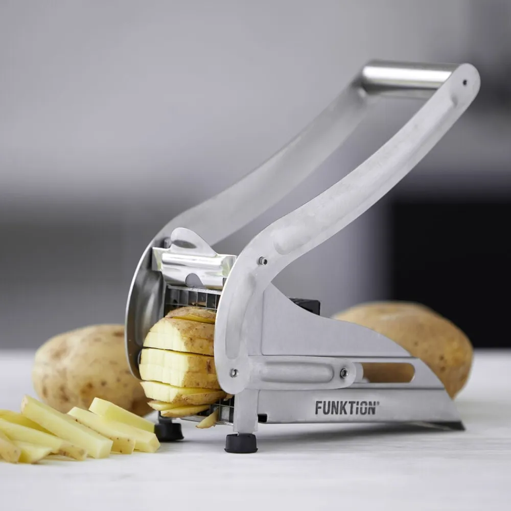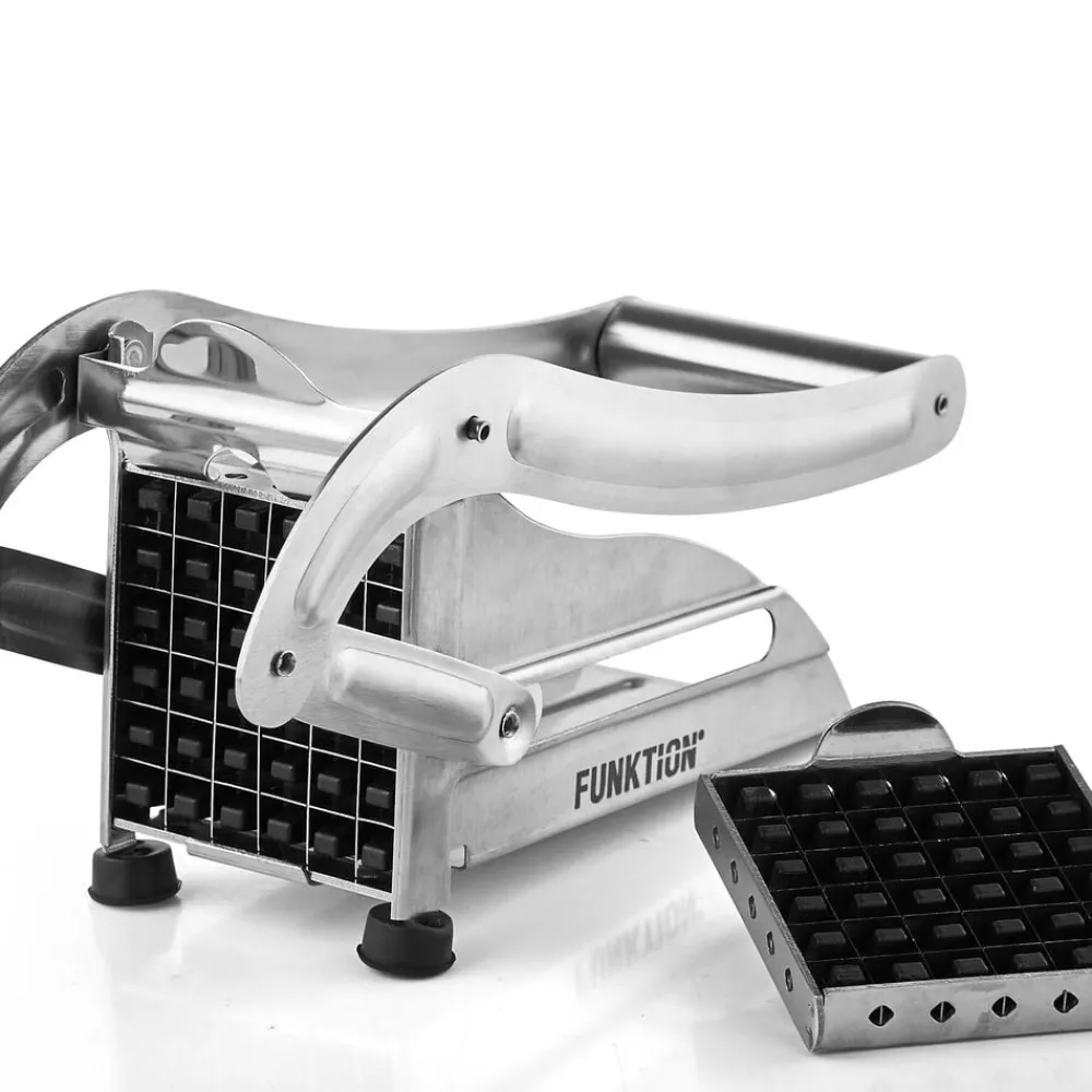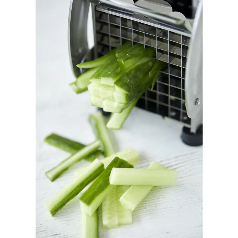 Pommes frites-jern fremstillet i rustfrit stål. To forskellige skær med henholdsvis 36 og 64 huller til at lave små og store pommes frites medfølger. Bør ikke anvendes til hårde rodfrugter eller søde kartofler.