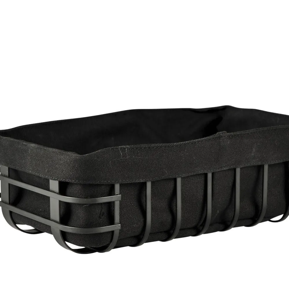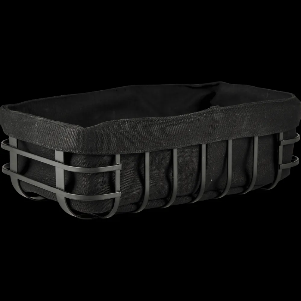 Byd morgenbrød og brødet til supper og salater rundt i en flot og rustik servering. Smart og rummelig brødkurv i mat, sort pulvercoated metal med sort stofpose i 100 % bomuld. 27 x 17 x 9 cm.