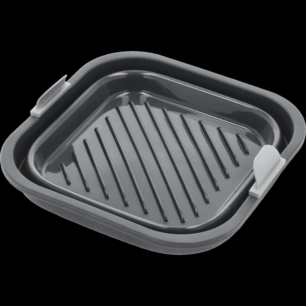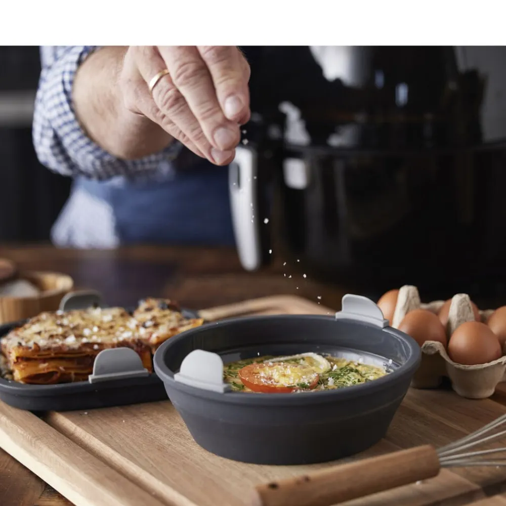 Den firkantede silikoneform passer perfekt i din airfryer. Du undgår klistrede og fastbrændte madrester i airfryeren, og silikoneformen er nem at vaske i hånden eller i opvaskemaskinen. Formen er 6 cm høj og kan foldes sammen, så den fylder minimalt ved opbevaring. Tåler ovn op til 220 grader.