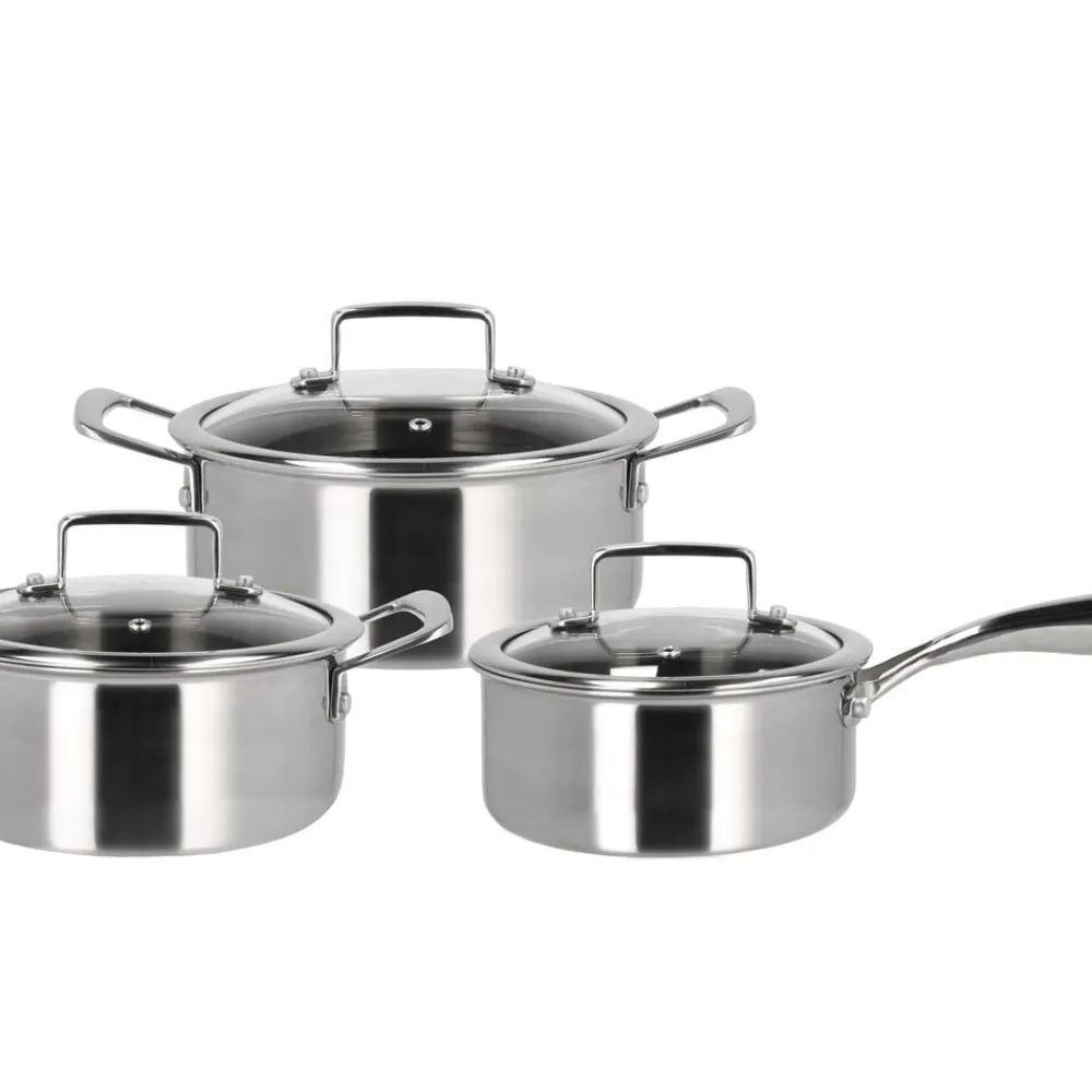 Grydesættet indeholder en kasserolle på 1,2 liter samt gryder på 2 og 2,7 liter, alle med låg.