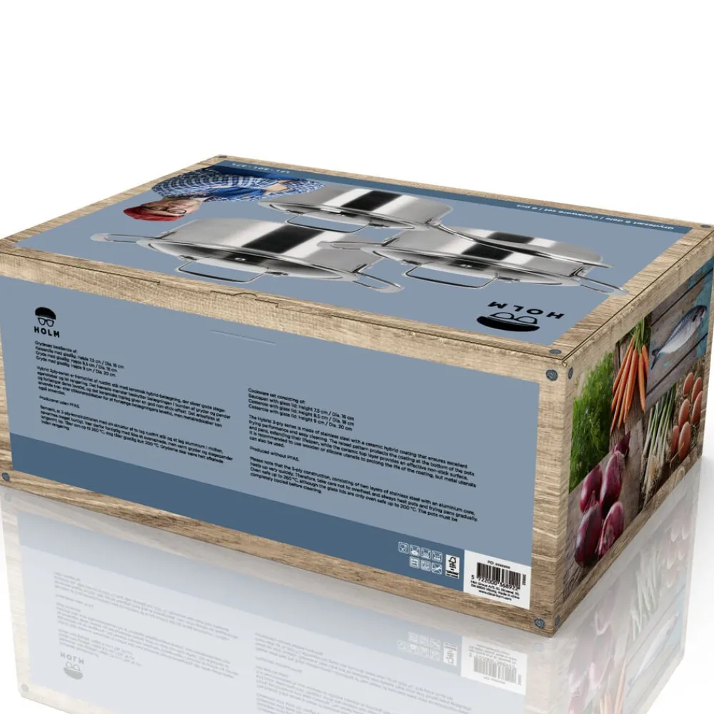 Hybrid 3ply-serien er fremstillet af rustfrit stål med keramisk hybrid-belægning, der sikrer gode stegeegenskaber og let rengøring. Bemærk, at 3-ply-konstruktionen med sin struktur af to lag rustfrit stål og et lag aluminium i midten, opvarmes meget hurtigt. Vær derfor forsigtig med ikke at overophede, men varm gryder og pander langsomt op.