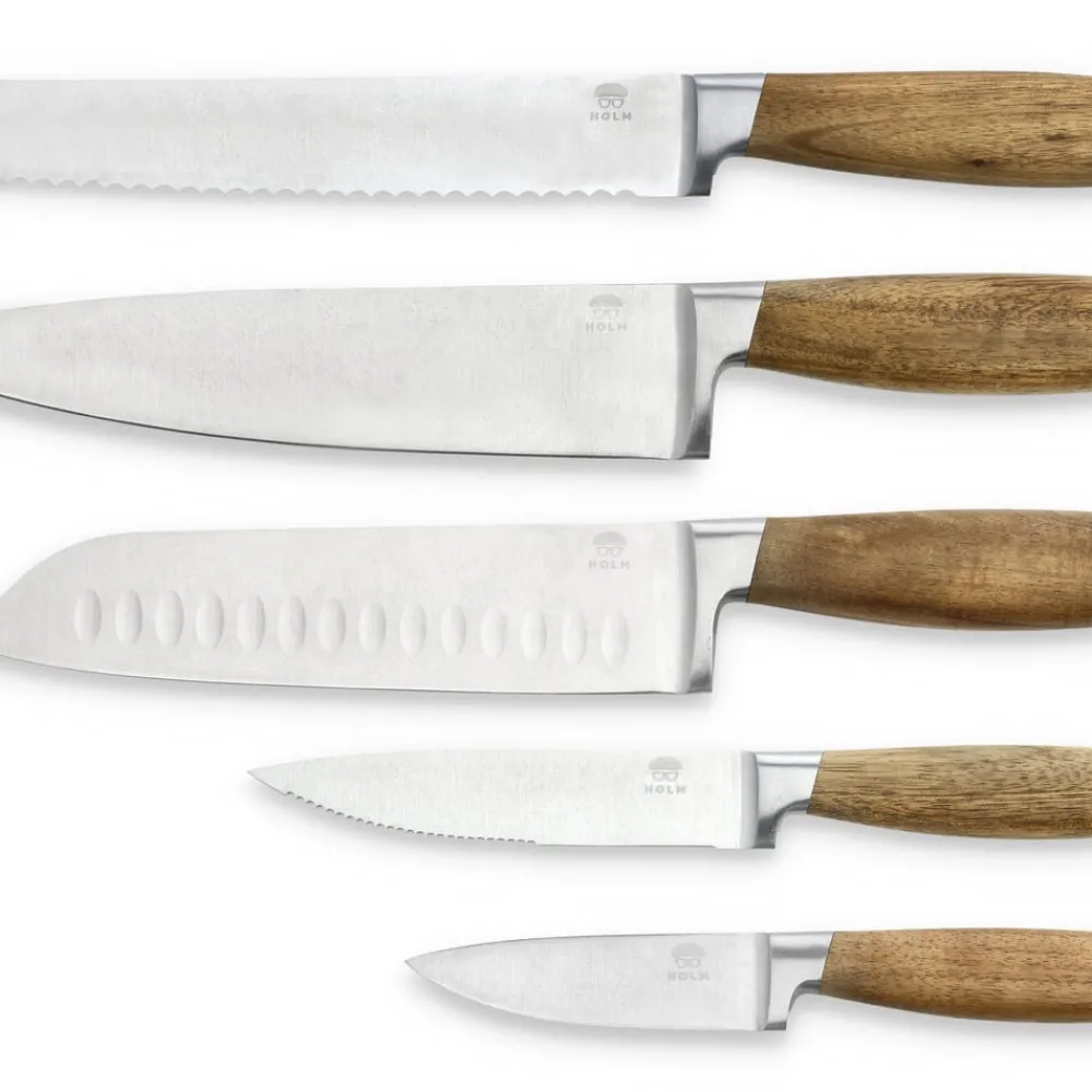Knivsættet indeholder fem lækre knive – urtekniv 20 cm, universalkniv 24 cm, santokukniv 31 cm, kokkekniv 33 cm og brødkniv 33 cm. De flot rundede skafter, der ligger behageligt i hånden, er af akacietræ med virkeligt smukke og karakteristiske åretegninger og er afsluttet med en elegant stålkappe for enden af skaftet. Bladene er af rustfrit stål i høj kvalitet. Knivene skal vaskes i hånden med varmt vand og sæbe, også før første brug.