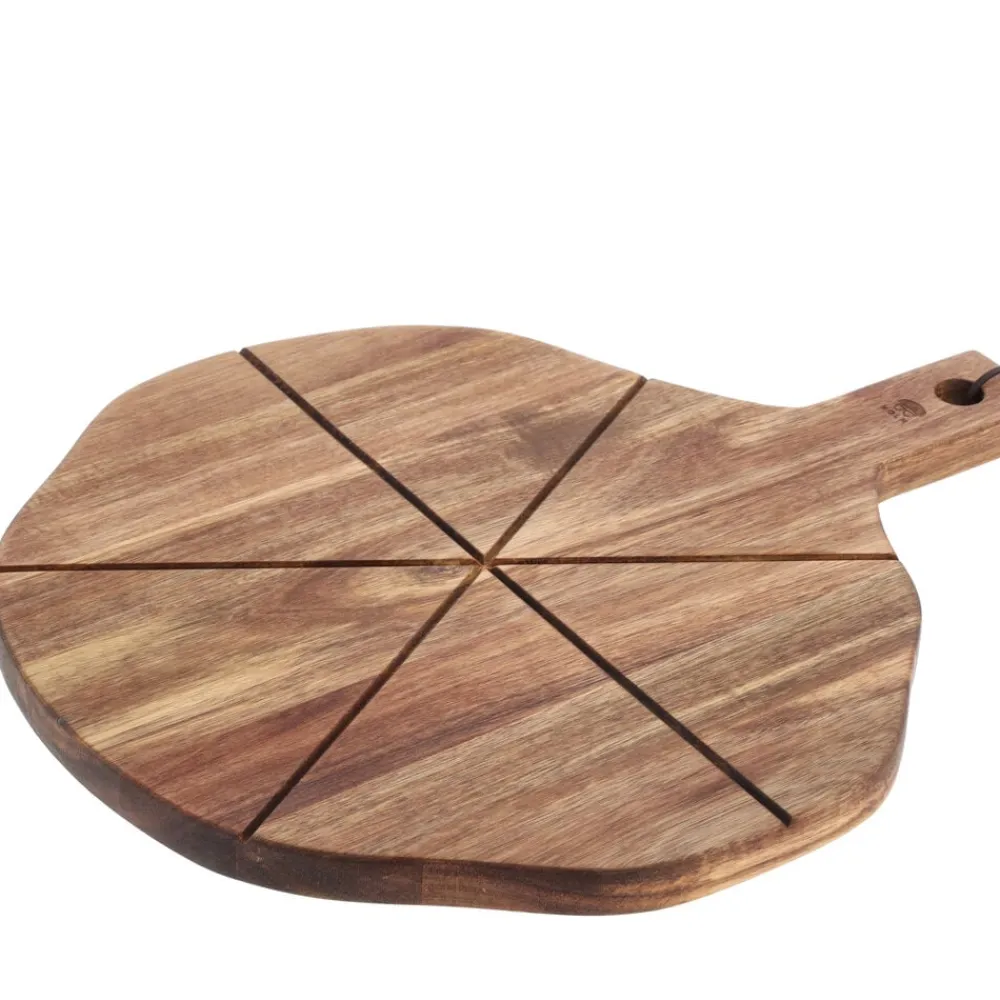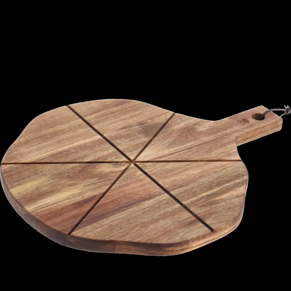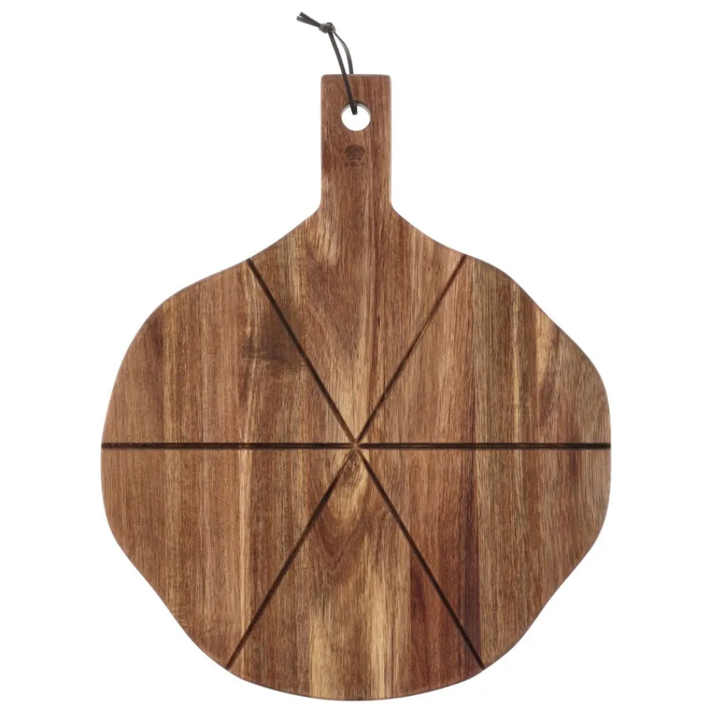 Pizzabræt i akacietræ med et solidt håndtag. Server en sprød pizza på et flot og rustikt serveringsbræt med riller, der gør det let at skære ud i lige store stykker. På den anden side er pladen glat og kan bruges til at servere fx ost og tapas på. 44 x 36 x 1,9 cm.