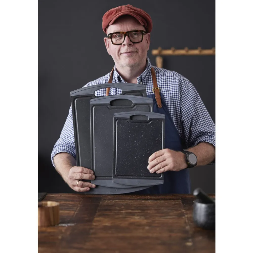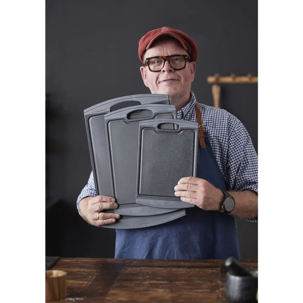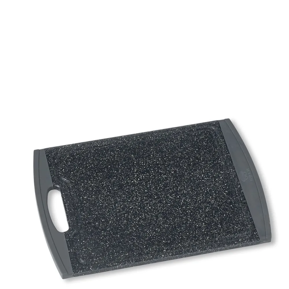 Skærebræt med kant i gråt gummi med anti-skrid-funktion. 29,2 x 20,3 x 1 cm. De skridsikre ender gør, at brættet ligger stabilt på bordet. Skærebrættet er forsynet med saftriller. Nemt at rengøre. Skærebrættet er fremstillet med en skæreflade i PP plast og en kant i TPE gummi.