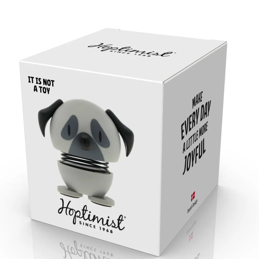 Lille, rund og helt uimodståelig. Denne Hoptimist-mops har hængeører, korte ben og det der klassiske, lidt mutte blik. Den hopper glad, når du giver den et kærligt klap.