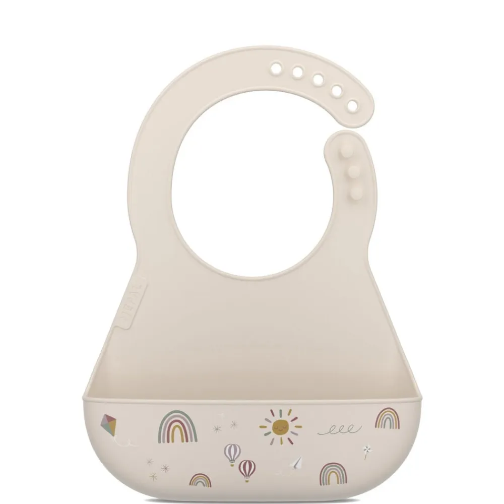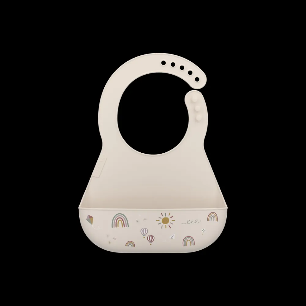 Hagesmæk af blød og fleksibel silikone med en stor lomme foran til at opsamle den mad og væske, der ryger forbi munden. Justerbar halslukning, så hagesmækken kan bruges i lang tid, mens barnet vokser. Hagesmækken kan blot skylles under vandhanen og tørrer hurtigt, og den kan også vaskes i opvaskemaskinen.