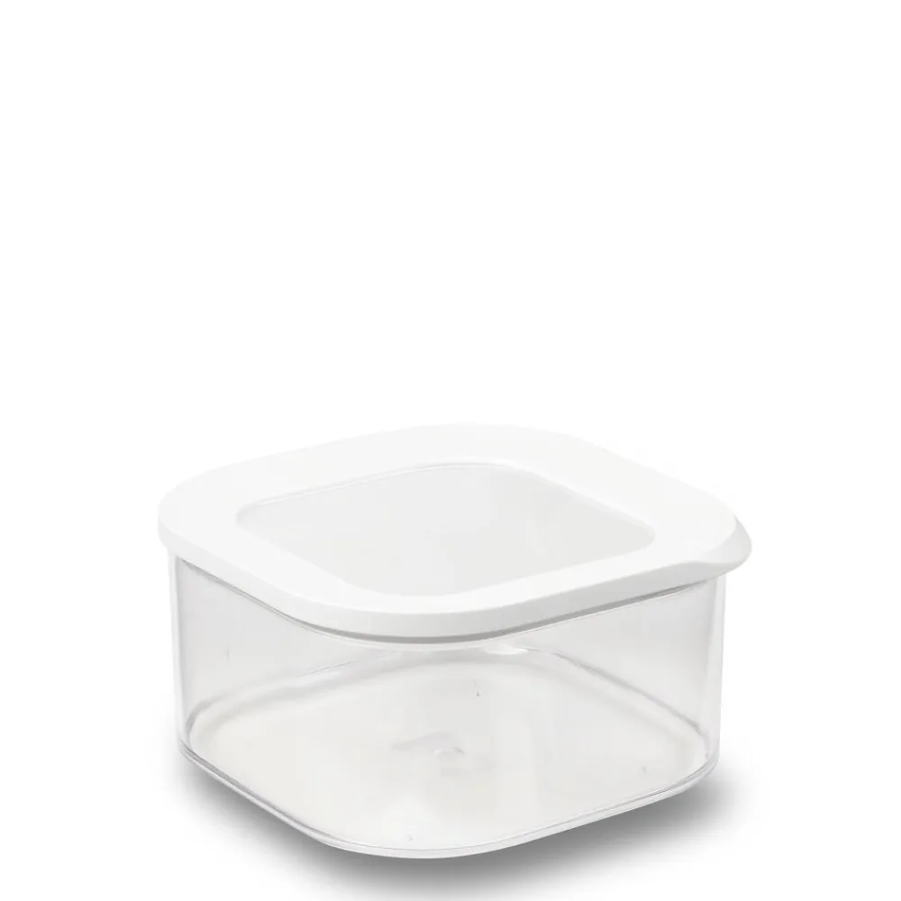 Modula opbevaringsboks med enkel, hvid kant på låget. Både boks og låg er gennemsigtige, hvilket gør det nemt at overskue indholdet. Mål: 16 x 16 x 8 cm. Boksen er fremstillet af SAN-plast, som er robust og modstandsdygtig overfor ridser. Velegnet til opvaskemaskine men ikke til mikroovn og fryser.