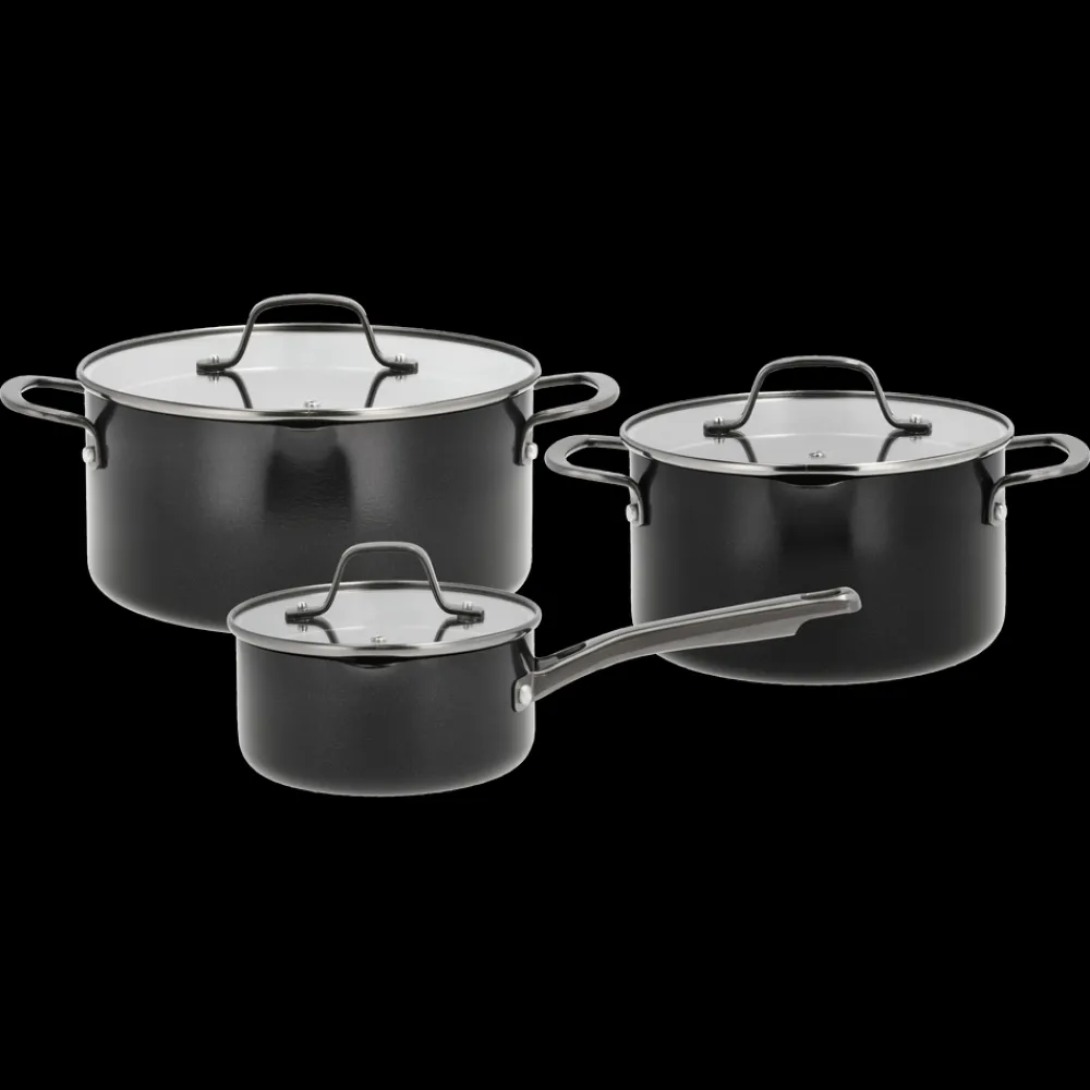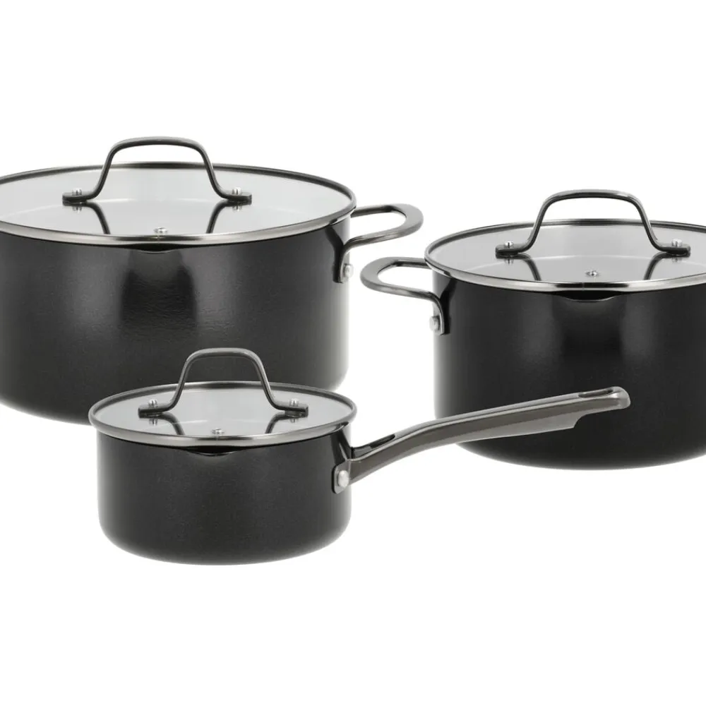 Grydesæt med 6 dele. Grydesættet består af en kasserolle på 1,5 liter (16 cm) samt gryder på 3,4 (20 cm) og 5,0 liter (24 cm), alle med glaslåg. Blavet-serien fra Pillivuyt Gourmet består af let og funktionelt kogegrej, der passer perfekt til madlavning i hverdag. Kroppen på seriens gryder og pander er fremstillet af 100 % genanvendt aluminium med sort keramisk belægning både indvendigt og udvendigt. Blavet-gryderne har måleskala på indersiden, hældetud og glaslåg med integreret si – så du f.eks. nemt kan hælde vand fra pasta og grøntsager. Blavet-gryderne er lette at håndtere og hurtige at opvarme, og den keramiske belægning på indersiden har en effektiv non-stick-effekt, som sikrer, at maden ikke brænder fast.