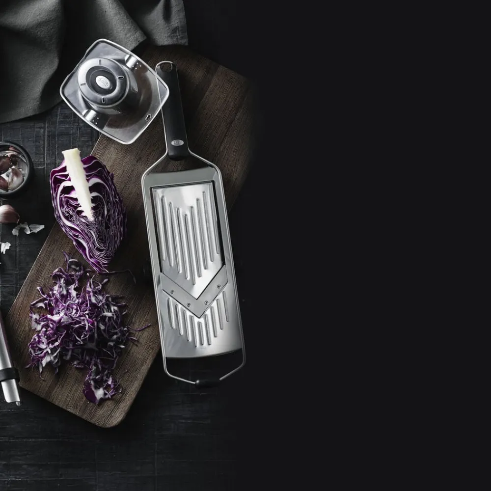 RÖSLE juliennejern til at skære grøntsager i flotte julienne-strimler – perfekt til supper, salater og wokretter. Du kan nemt ændre strimlernes størrelse ved at udskifte snittepladen, hvor der medfølger 3 forskellige.