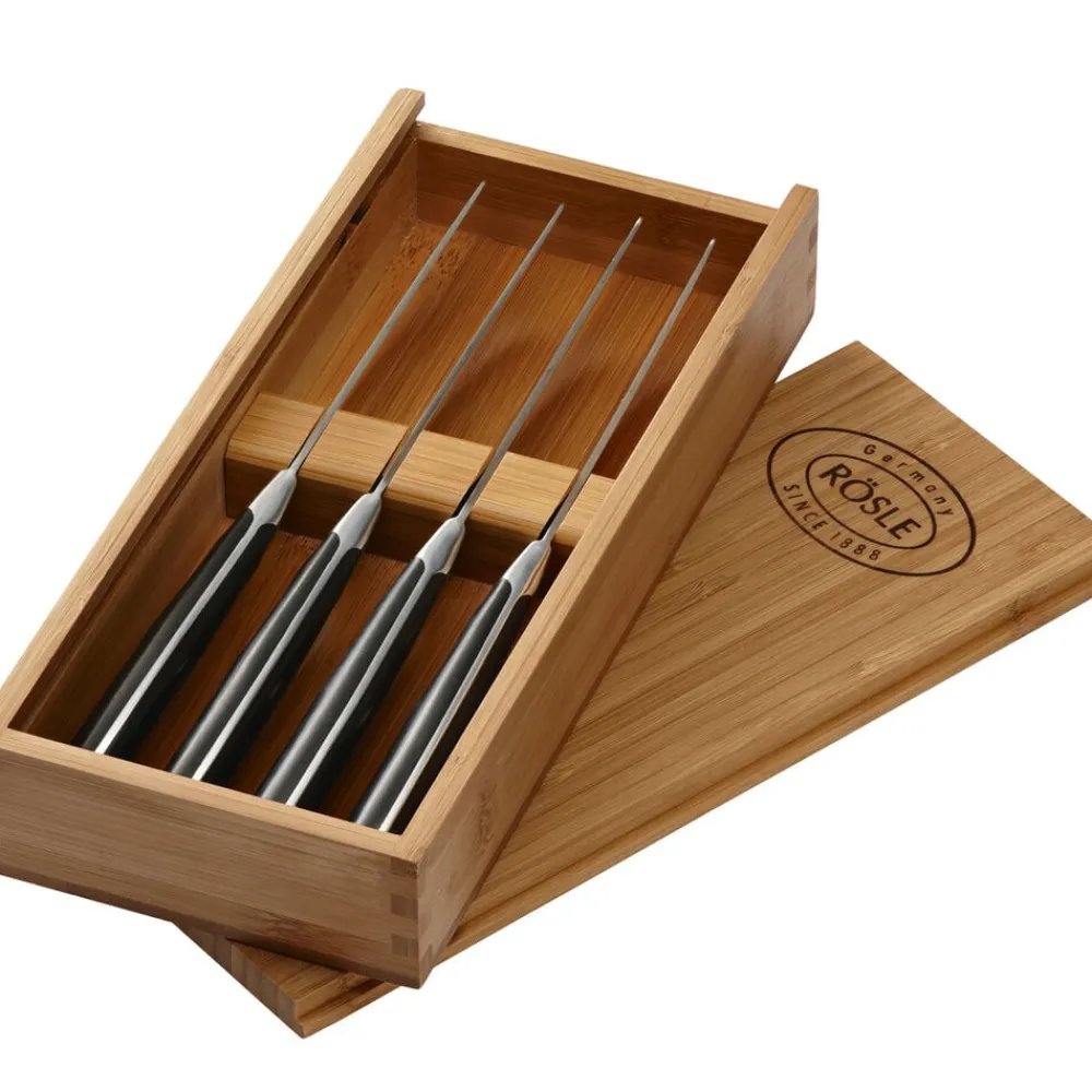 Sæt af 4 RÖSLE steakknive. Plastikhåndtag i POM med tre nitter. Knivblad i stål. Leveres i flot trææske.