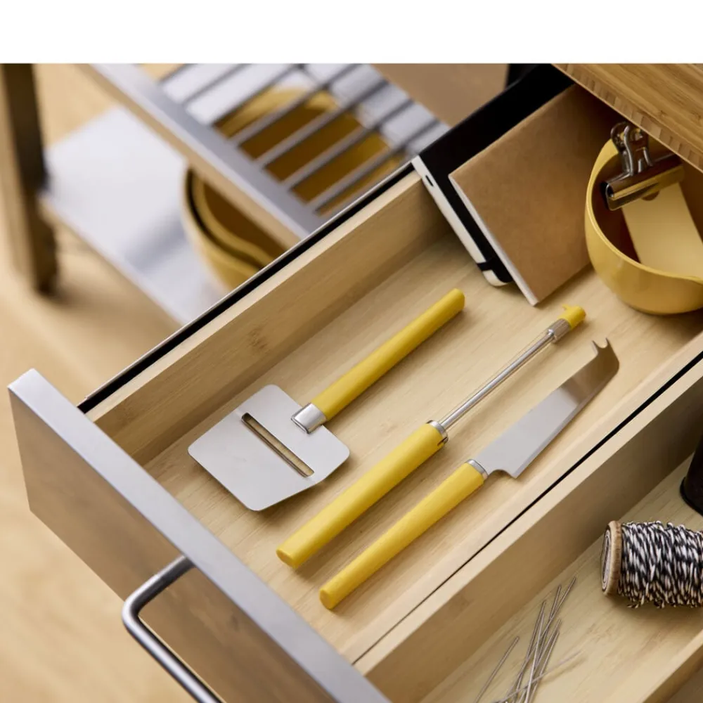 De gedigne materialer, plast og rustfrit stål, komplementerer hinanden smukt og giver redskaberne en tyngde, der skaber en god balance i hånden. Det rustfri stål er af høj kvalitet, der sikrer både skarphed og nem rengøring. Redskaberne fås i en række smukke farver, der gør dem til favoritter både i køkkenet og på spisebordet. 5 års garanti.