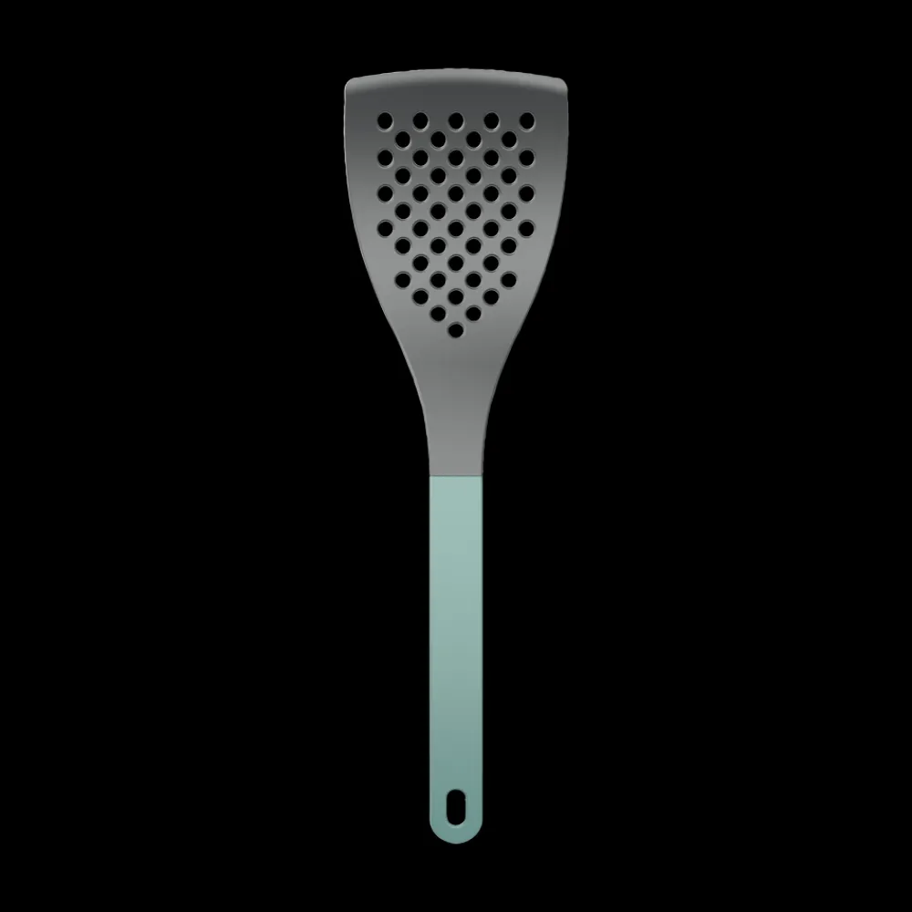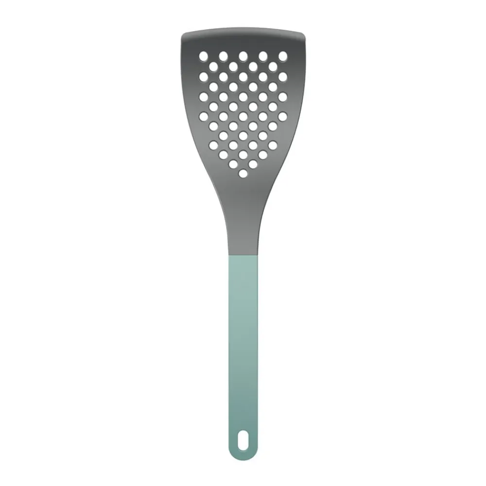 Stor palet med farvet skaft. 31 cm. Bladet er perforeret, og med en bredde på 8,5 cm er paletten velegnet til at håndtere større fødevarer på panden, såvel kød som grøntsager. Fremstillet i nylon, der er skånsomt mod gryder og pander med belægning og tåler varme op til 220 grader C. Slankt og ergonomisk design med praktisk ophængshul. Velegnet til opvaskemaskine.