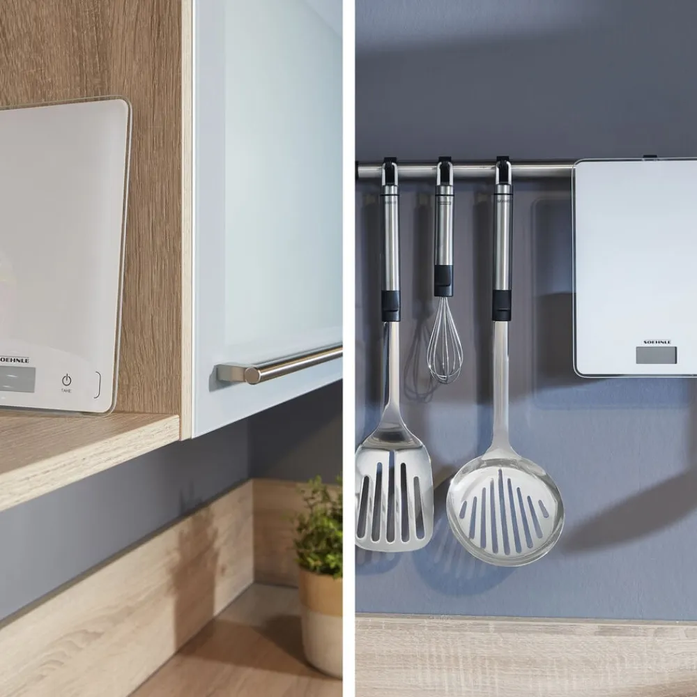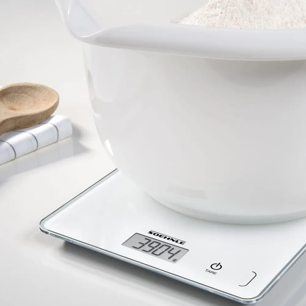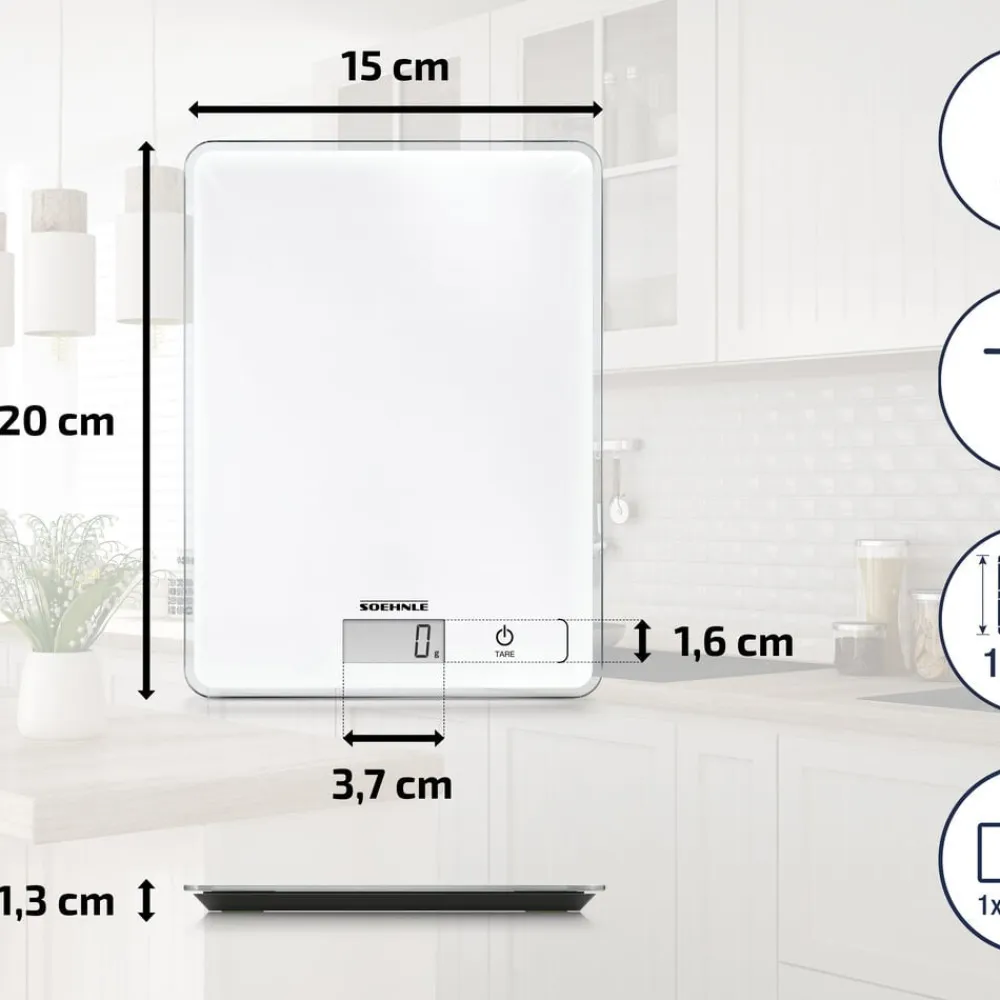 Køkkenvægt i kompakt og ekstra tyndt design, 20 x 15 x 1,3 cm. Vejer op til 5 kg med interval på 1 g, hvilket gør den ideel til fx krydderier. Letlæseligt display, tarafunktion og energisparende autosluk-funktion. Enhederne vises i g/kg eller oz/lb.