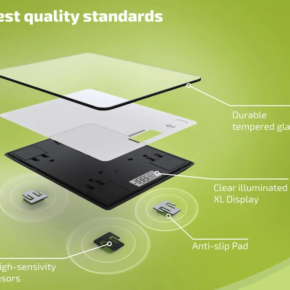 Køkkenvægten står på skridsikre fødder og har en overflade af praktisk sikkerhedsglas, der er hurtigt og nemt at gøre rent. Vægten har børnesikret batterirum, og 1 x 3V batteri er inkluderet. 5 års garanti.