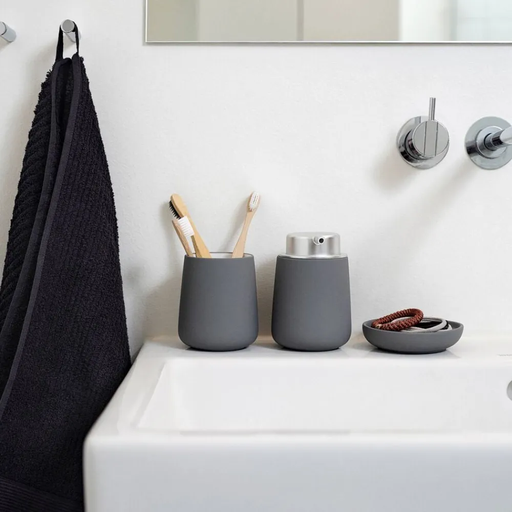 Tandbørstekruset fra Nova badserie spreder ro og harmoni på badeværelset. Serien skaber fornemmelsen af luksus og spa-stemning med sin uimodståelige, lækre soft touch-overflade med detaljer i stål-look og et blødt formsprog. Dia. 8 cm, højde 10 cm.