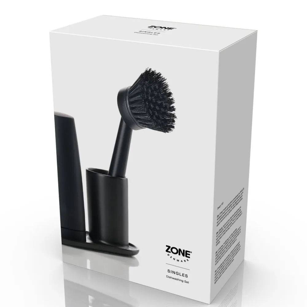Enkelt, handy og helt diskret opvaskesæt fra Singles. Holderen af keramik kan sættes i opvaskemaskinen, og du kan udskifte børstens hoved. Den løse dispenser doserer sæben med et let tryk og sættes herefter tilbage på plads.