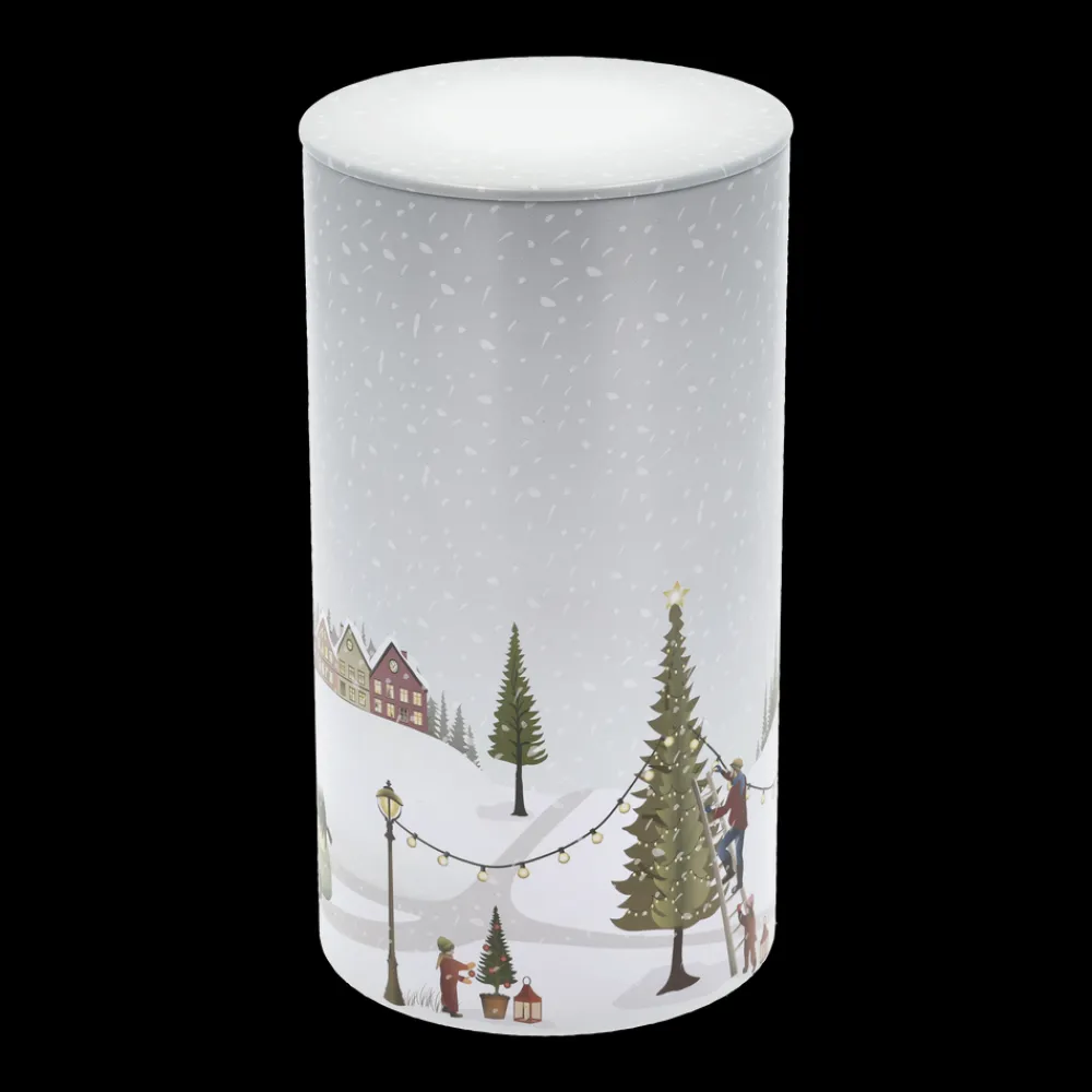 Kagedåse af metal med eventyrlige vintermotiver. Serien Vinter er skabt i samarbejde med designer Dorthe Mathiesen. Hendes motiver med den karakteristiske grafiske streg og lyse, nordiske pastelfarver afspejler stemningen i de hyggelige vintermåneder og fortæller historier fra de små samfund om leg i sneen, stemningsfulde vinterlandskaber og samvær med familie og venner, som beskueren kan hoppe ind i og selv bygge videre på.