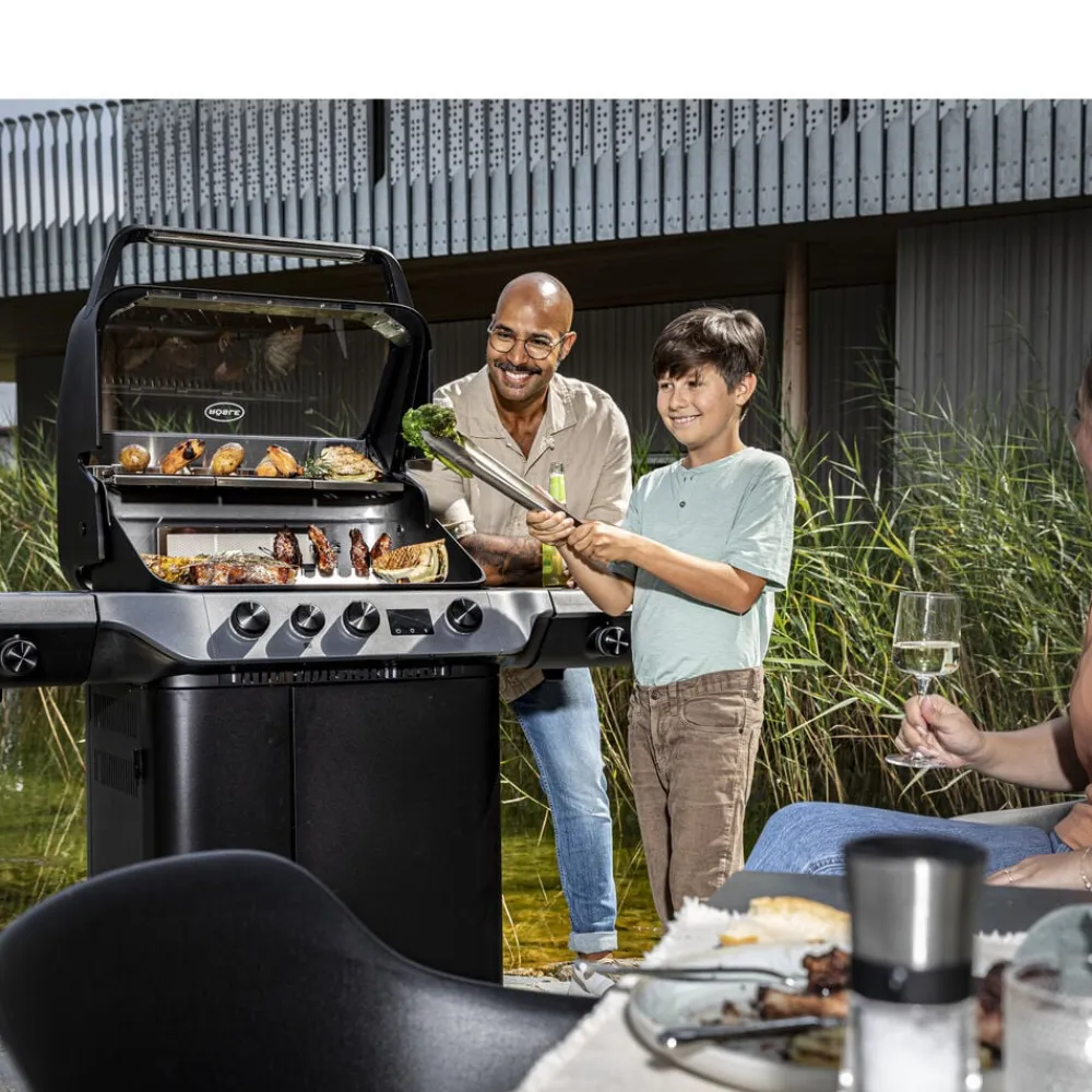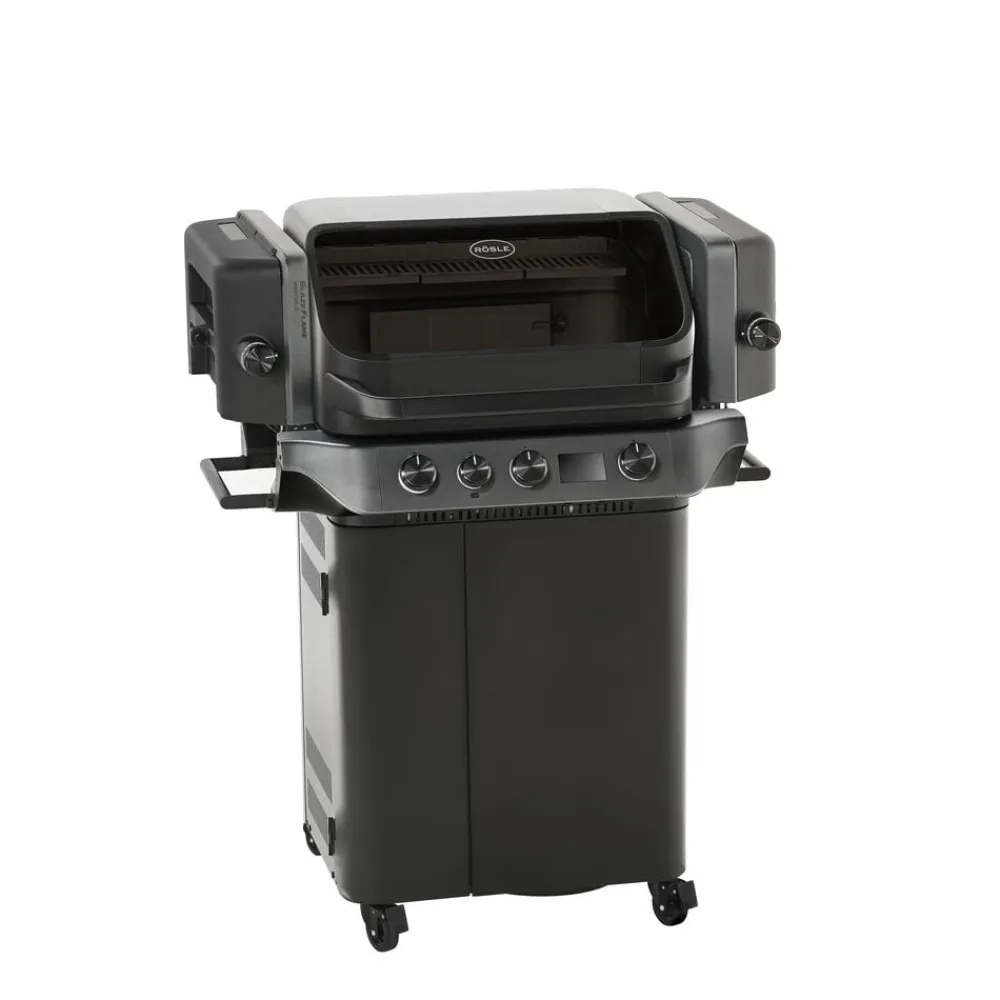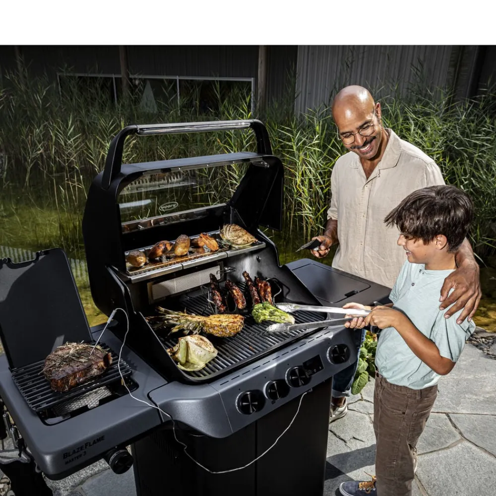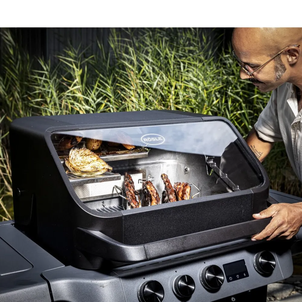 Blazeflame Master 3 har et stort panoramavindue med integreret lys, så du kan følge med i tilberedningen uden at åbne låget. De foldbare sideborde sparer plads, når grillen ikke er i brug, og de oplyste drejeknapper i to farver gør betjeningen intuitiv – selv efter mørkets frembrud. XXL-primezone med en ekstra kraftfuld og integreret sidebrænder (hele 5,0 kW) i det venstre sidebord når op til 800 °C, ideelt til lynstegning og intens varme. En praktisk kogeplade (3,5 kW) i det højre sidebord gør det nemt at tilberede saucer og tilbehør. Infrarød bagbrænder (3,6 kW) ideel ved brug af rotisseri.