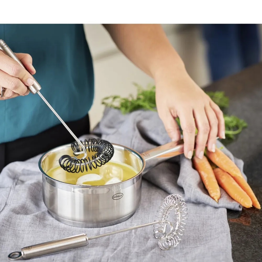Piskerisets spiralhoved kommer nemt rundt i hele gryden, også hjørner, der ellers kan være svære at nå. Materialerne 18/10 rustfrit stål og silikone klarer selv høje temperaturer på op til 260 °C. Tåler opvaskemaskine.