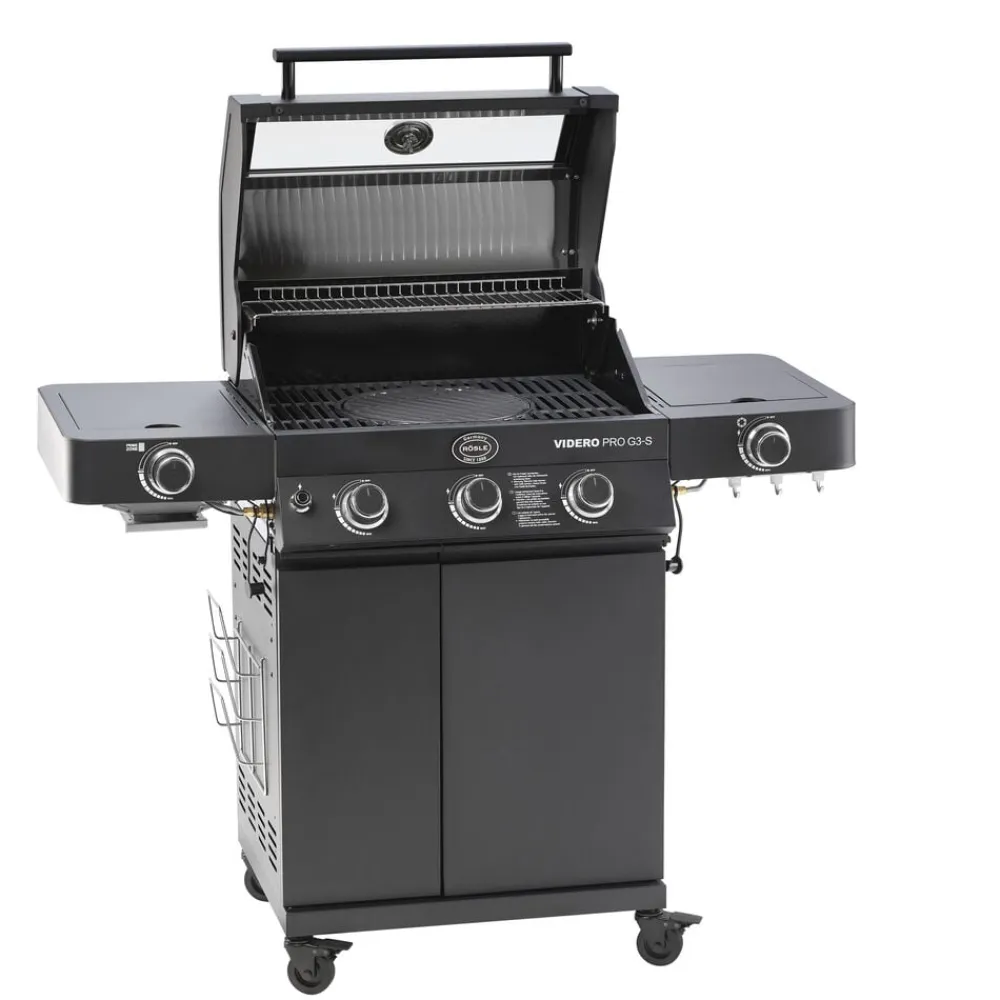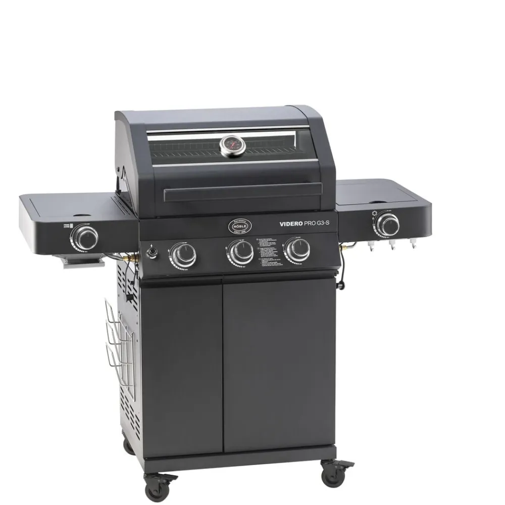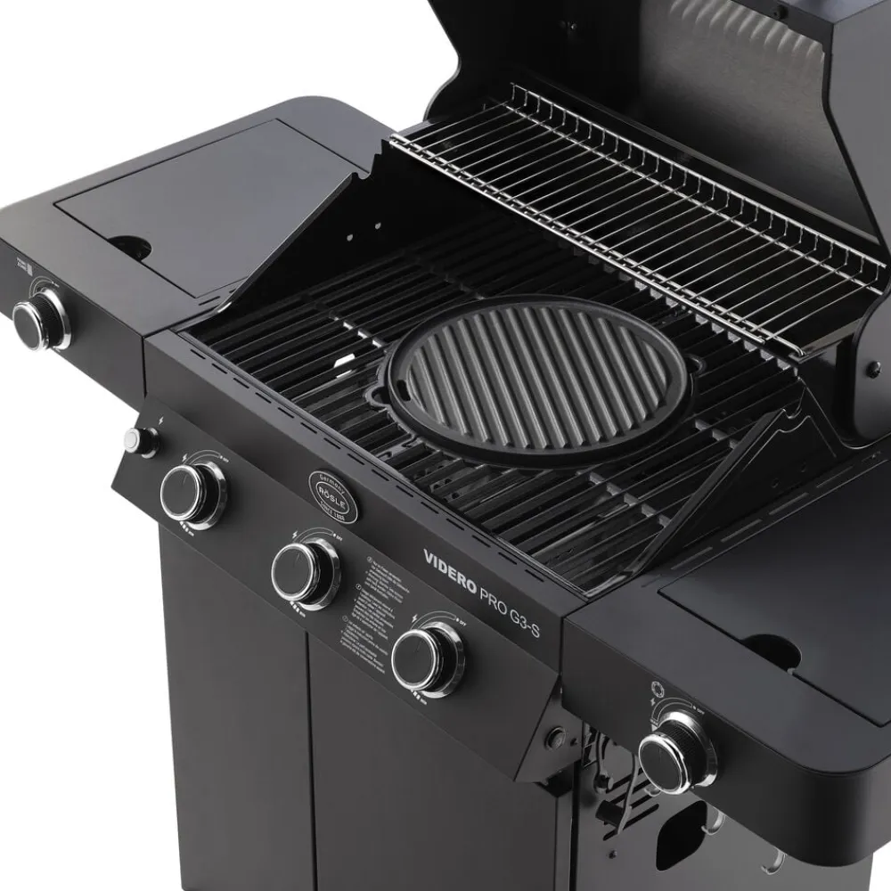 Rösle Videro Pro G3-S Vario+ i mat sort med mange funktioner. 3 hovedbrændere af rustfrit stål (hver 3,5 kW). Hovedgrillområde: 60 x 45 cm, opvarmningsstativ: 60 x 16 cm. Kraftige grillriste af emaljeret støbejern giver de klassiske grillstriber. Det unikke og fleksible Vario+ grillsystem giver mange anvendelsesmuligheder: Grillen indeholder tre riste, hvoraf den runde kan fjernes og erstattes af en pizzasten (23937), en grillplade (24145), en gryde (24404) eller en wok (24143), som kommer tæt på varmekilden og derved kan opnå høj varme. Den smarte holder gør det nemt at opbevare pizzasten og grillplade. Der fås også et cover (varenr. 23916) og et rotisseri (varenr. 23930) til Rösle Videro Pro G3-S gasgrill, som kan tilkøbes separat.