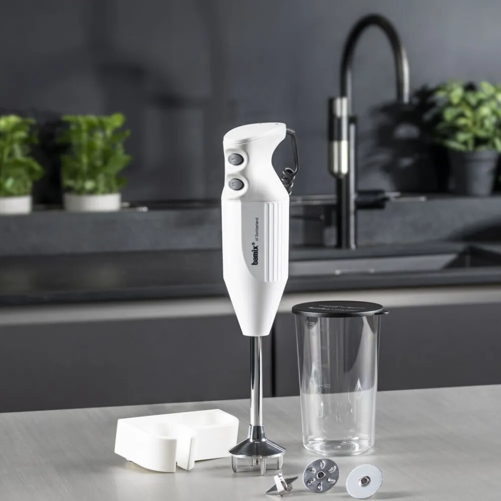 bamix® Mono-stavblender med en kraftig 200 watt motor, der sikrer pålidelig hjælp til selv de hårdeste opgaver i køkkenet. Stavblenderen har to hastighedsindstillinger og en praktisk ledning, der giver masser af fleksibilitet. Til produktet medfølger multifunktionskniv, blenderskive, piskeskive, bæger med låg 600 ml og vægholder samt en instruktionsmanual. Livstidsgaranti på motor.