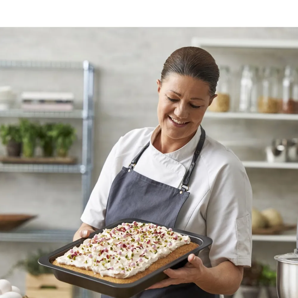 Smør formens indvendige side og bund med bagespray eller neutral olie ved bagning. Formen er fremstillet af ECCES stål, en europæisk produceret ståltype i høj kvalitet. Stålet er bygget op i to lag, først et støttende, forstærket bundlag og herefter endnu et lag for yderligere forstærkning. Det er meget let og fleksibelt, hvilket giver en mere ensartet overflade og bedre varmefordeling. Formen vaskes før brug første gang. Den keramiske belægning er fremstillet af råvarer, der ikke indeholder PFAS.
