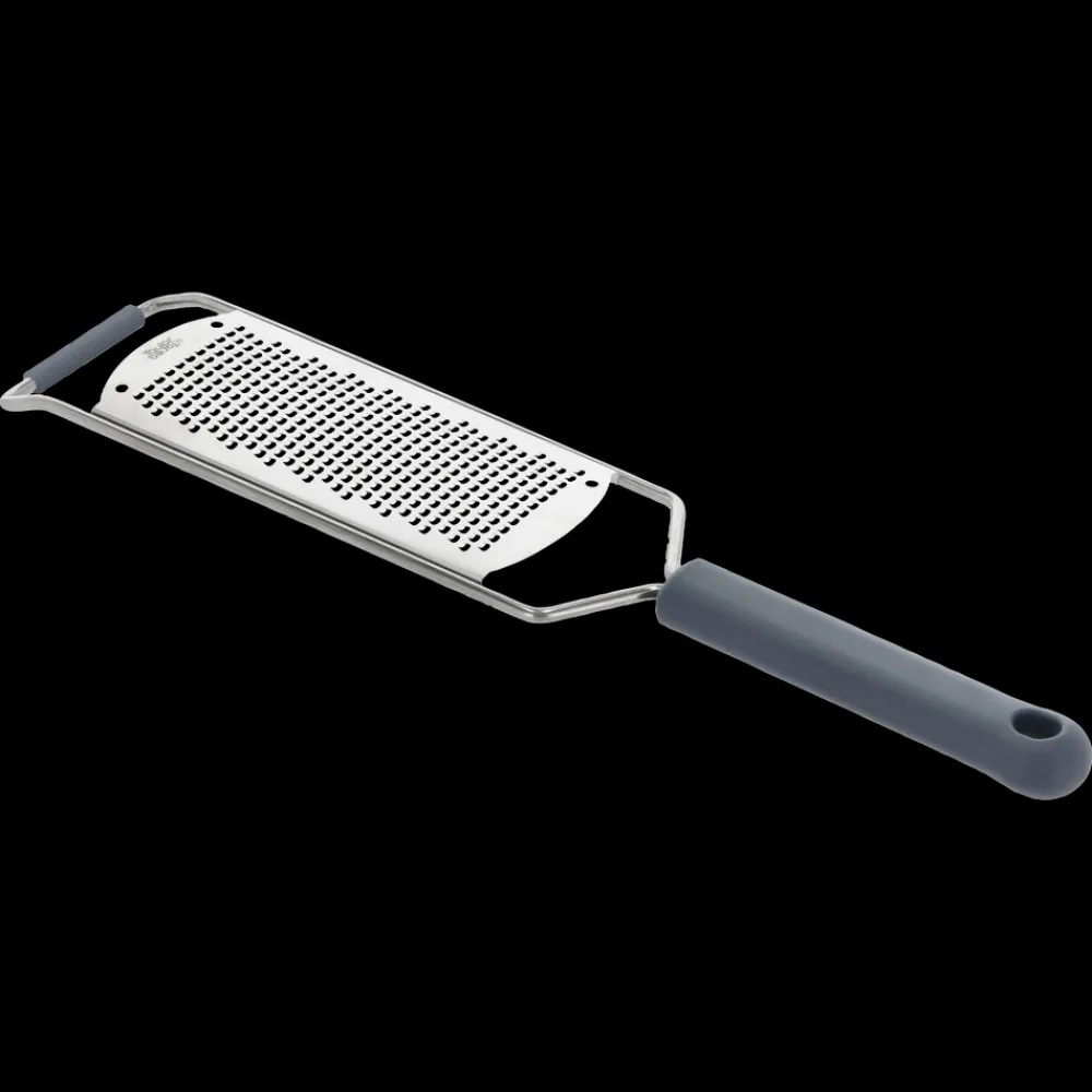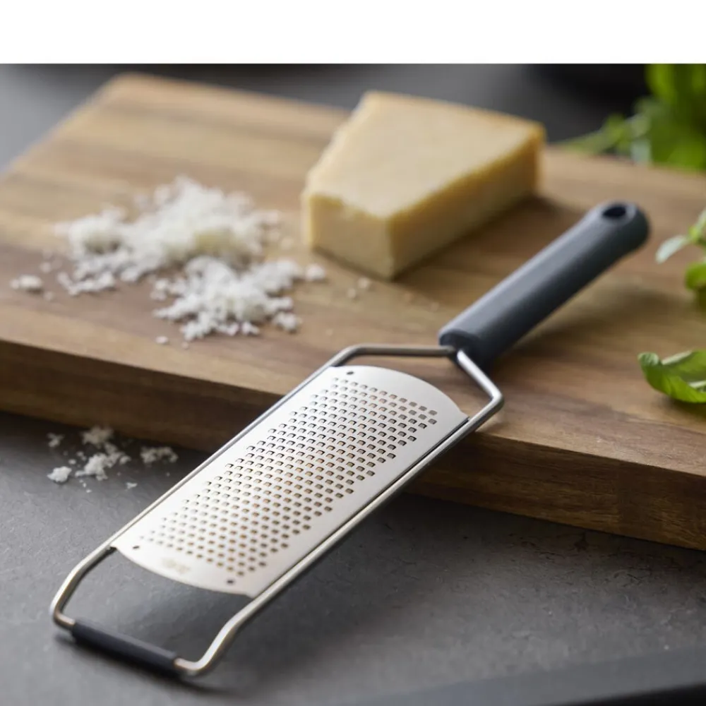 Fint rivejern i rustfrit stål med håndtag af hård plast og silikonestøtte i toppen af rivejernet. Rivejernet er oplagt til rivning af for eksempel parmesanost og citrusskal.