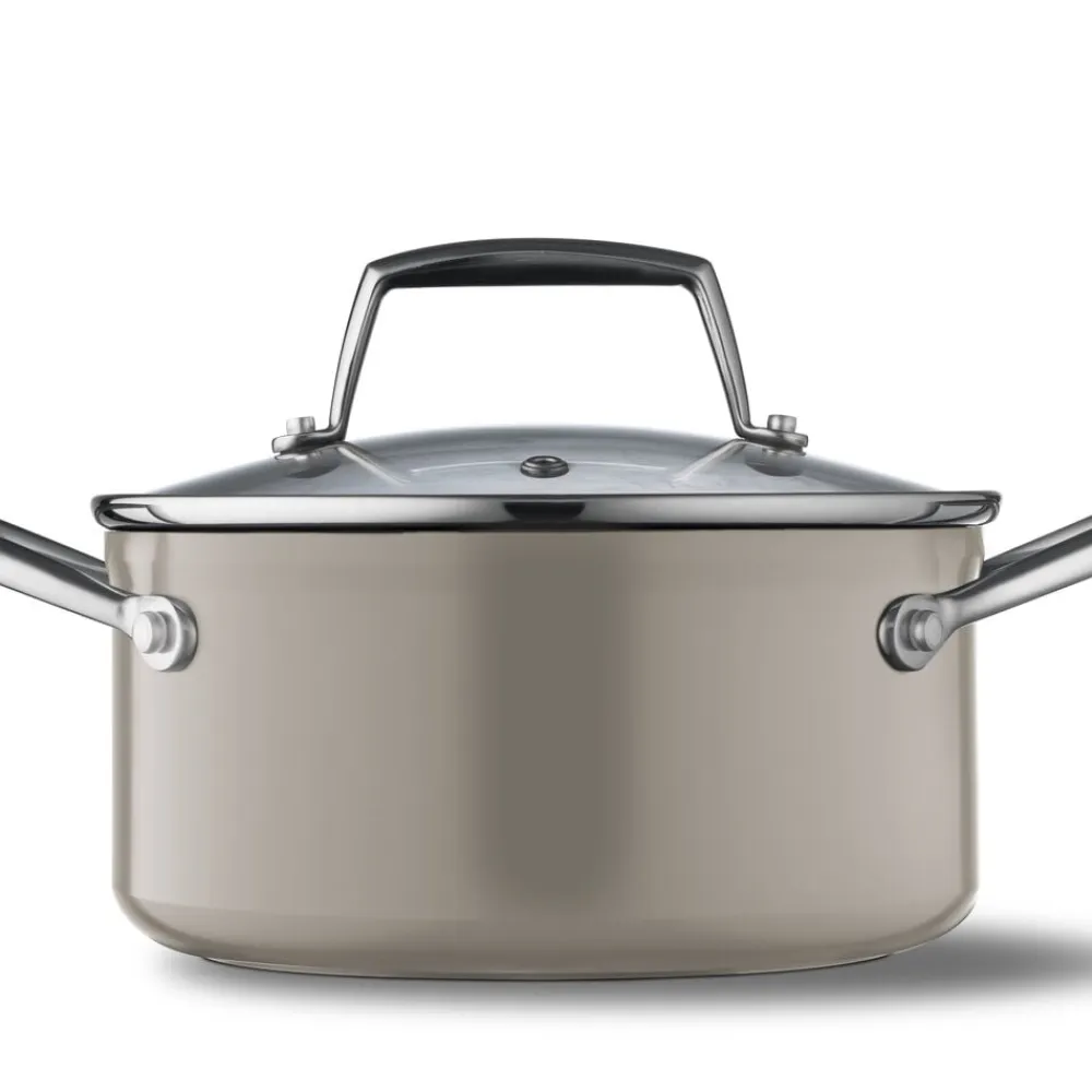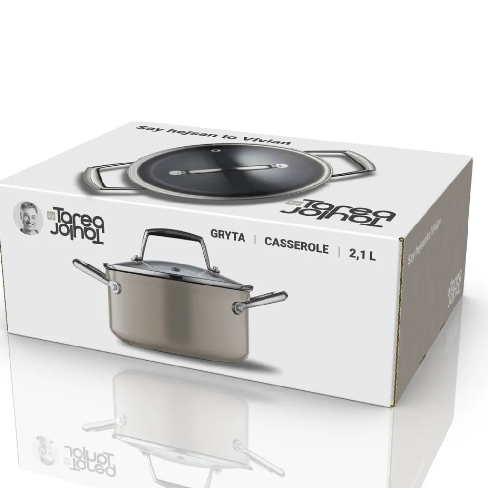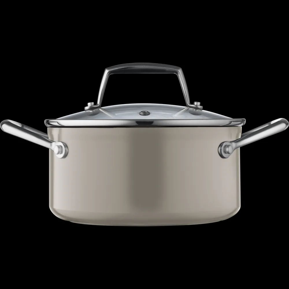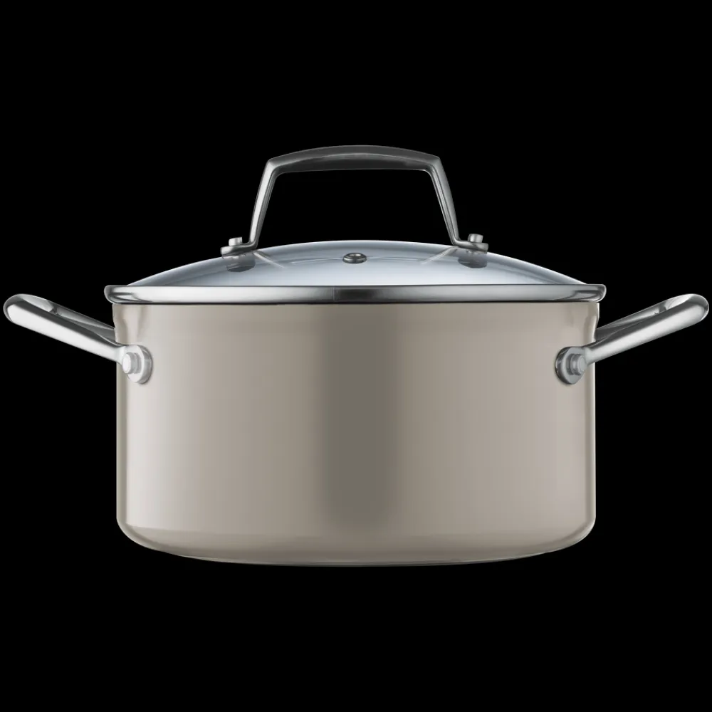 Gryde fremstillet af støbt aluminium, som sikrer, at varmen fordeles og fastholdes jævnt og effektivt over både bund og sider. Gryden har en tolags keramisk belægning med non-stick-funktion, er velegnet til alle varmekilder, tåler op til 220 grader C i ovnen og kan gå i opvaskemaskinen. Tåler alle typer redskaber, har tilhørende glaslåg og kan indeholde 5,6 liter.