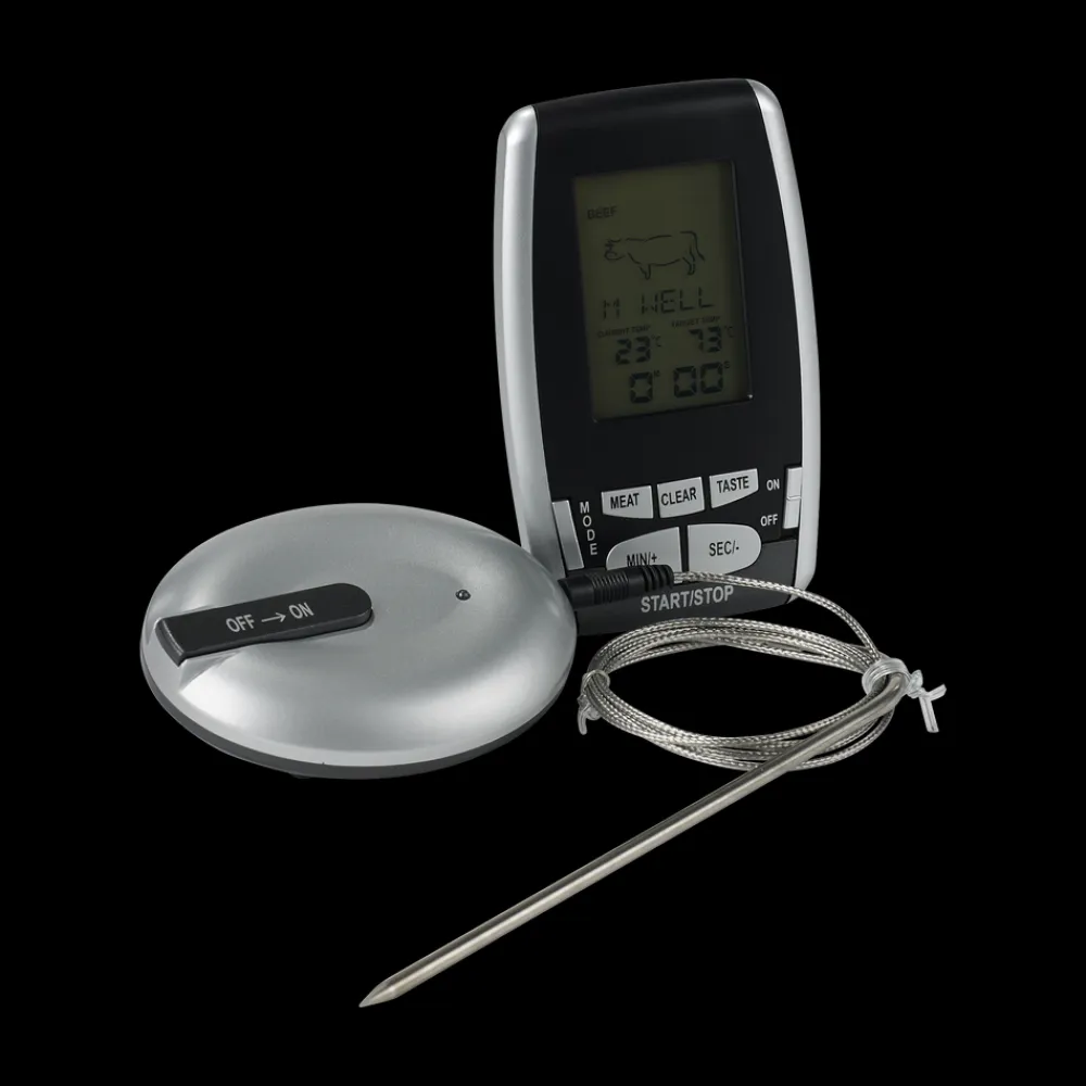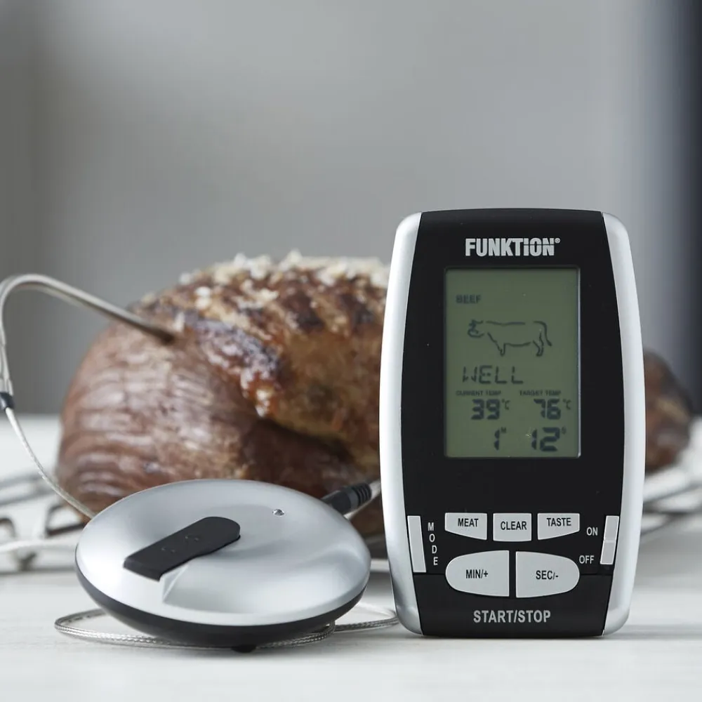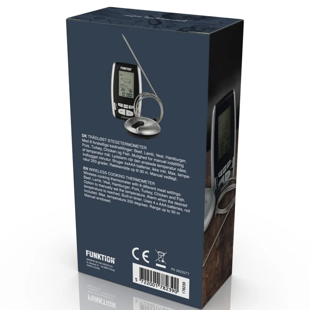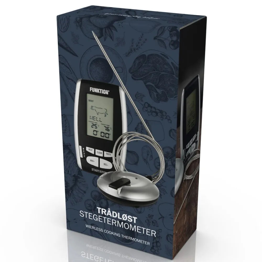 Trådløst stegetermometer med 8 forskellige kødinstillinger: Beef, Lamb, Veal, Hamburger, Pork, Turkey, Chicken og Fish.