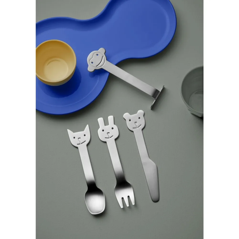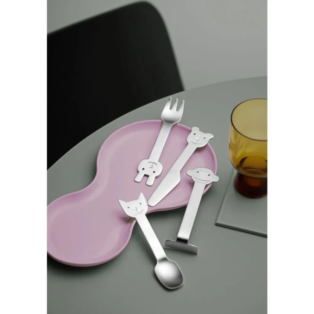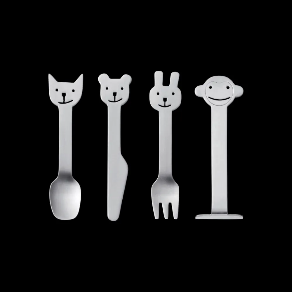 Animal Friends er et skønt børnebestik i rustfrit stål formgivet af Karin Mannerstål. Når den lille kanin, bjørn, kat og abe finder vej til spisebordet, har børnene fået venner, der er glade for at hjælpe med at gøre måltidet endnu sjovere. Perfekt egnet til børn i alderen 1-4 år. Tåler opvaskemaskine.