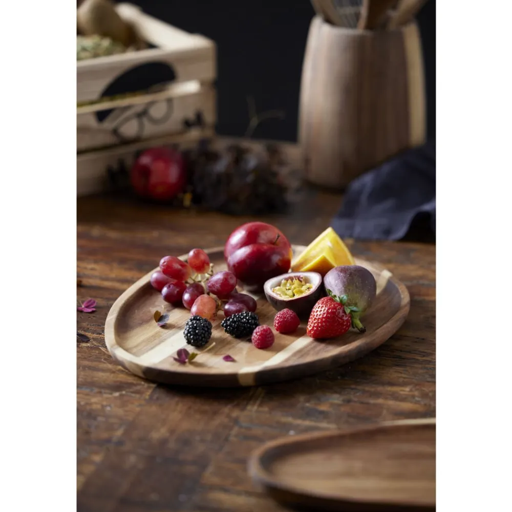 Lækkert serveringsfad i akacietræ i en flot organisk form. Fadet kan bruges til det meste, for eksempel tapas, kager, snacks, og det kan også stå uden indhold med akacietræets fantastiske farvespil som et dekorativt element. 30 x 24,5 x 1,5 cm.