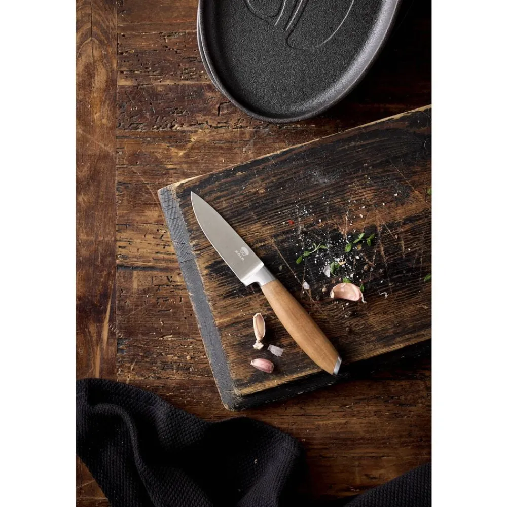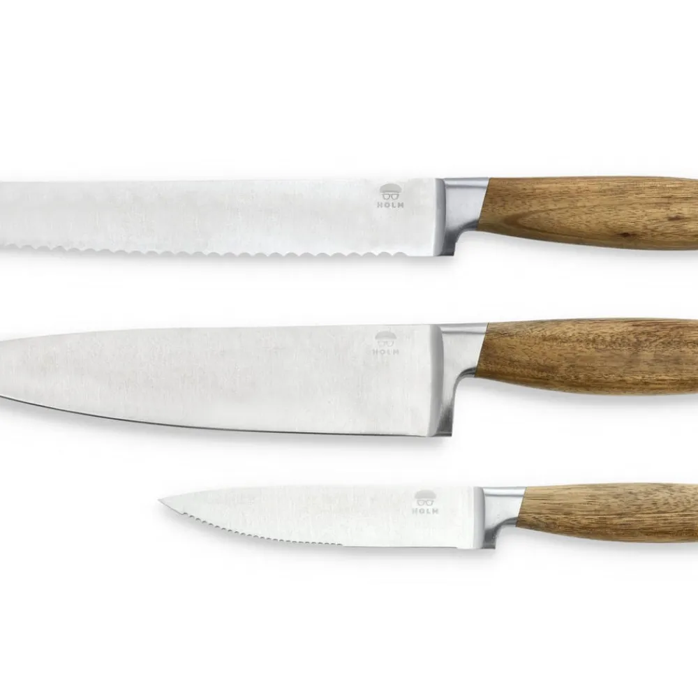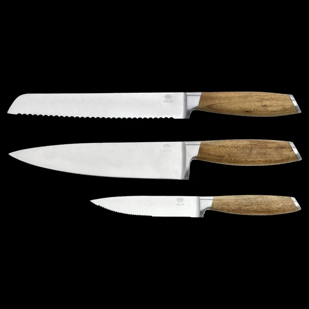 Knivsættet indeholder tre lækre knive – universalkniv 24 cm, kokkekniv 33 cm og brødkniv 33 cm. De flot rundede skafter, der ligger behageligt i hånden, er af akacietræ med virkeligt smukke og karakteristiske åretegninger og er afsluttet med en elegant stålkappe for enden af skaftet. Bladene er af rustfrit stål i høj kvalitet. Knivene skal vaskes i hånden med varmt vand og sæbe, også før første brug.