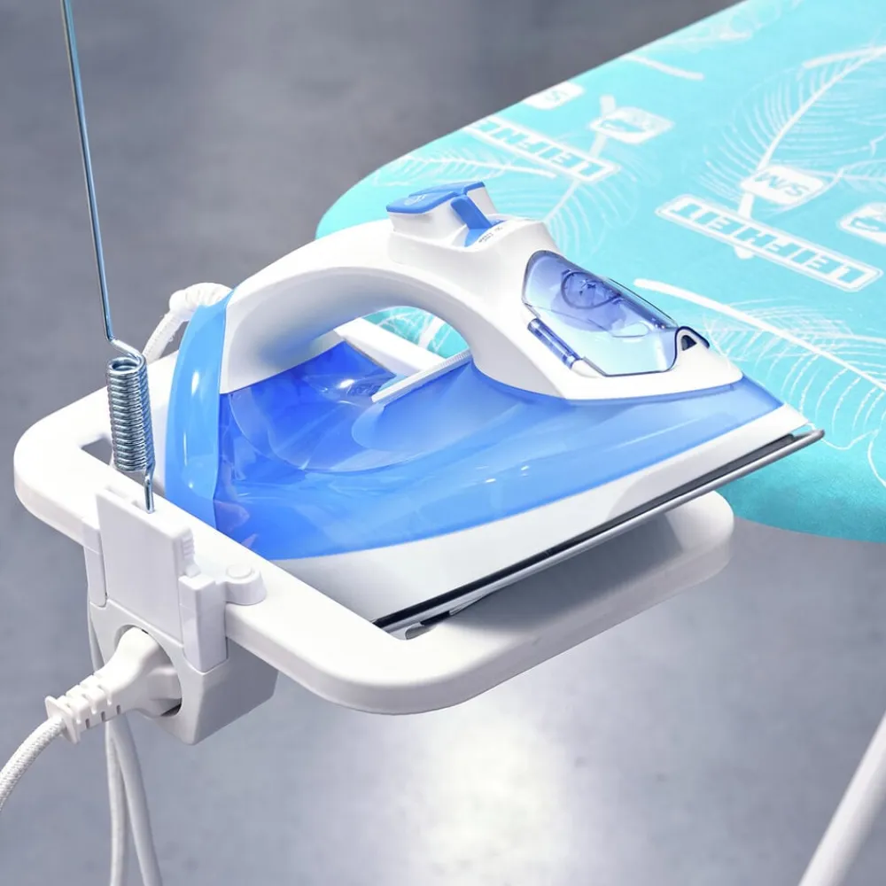 Designet til brug med både standard- og dampstrygejern og forsynet med fast metalholder til strygejernet, stikkontakt og kabelholder, der forhindrer, at ledningen er i vejen under strygningen.