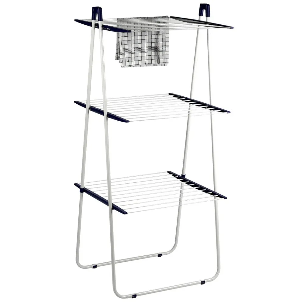 Dette høje tørrestativ er oplagt at bruge i brusenichen eller andre steder, hvor pladsen er trang. Selv om det næsten ingenting fylder i gulvareal, har det med sin højde på 150 cm plads til at tørre meget tøj ad gangen. Der er to smarte sokkeholdere, og midterniveauet kan foldes til side og give plads til at tørre lange stykker tøj.